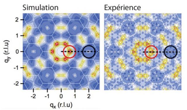 Analyses dans l'espace de Fourrier de simulations Monte-Carlo et d'une image de configurations magnétiques. Les cercles rouges et noirs entourent des pics de Bragg associés à un ordre à grande distance et au processus de fragmentation du magnétisme. Illustration: CNRS