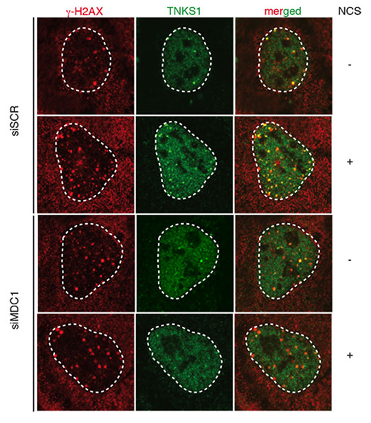 Figure: Les Tankyrases sont recrutées au niveau des cassures double brin de l'ADN grâce à leur interaction avec la protéine MDC1. Des cellules de sarcome U2OS transfectées avec un siARN témoin (siSCR) ou dirigé contre l'ARN messager de la protéine MDC1 (siMDC1), ont été traitées à la néocarzinostatine pour induire des cassures de l'ADN avant d'être observées en microscopie à fluorescence. Les cassures sont visualisées grâce à la localisation du signal de l'histone g-H2AX. La Tankyrase1(TNSK1) est recrutée au niveau de ces lésions dans les cellules témoin (siSCR). Ce recrutement est fortement diminué dans les cellules où la protéine MDC est absente (siMDC1).
