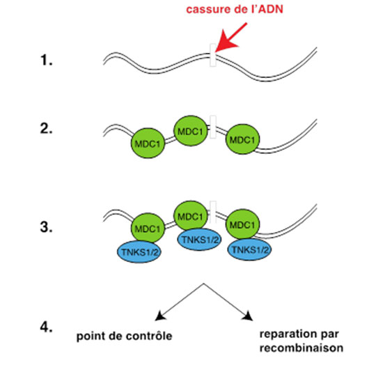 L'équipe d'Evi Soutoglou à l'Institut de génétique et de biologie moléculaire et cellulaire a identifié deux partenaires de MDC1 inconnus auparavant: Tankyrase 1 (TNKS1) et Tankyrase 2 (TNKS2) faisant partie du groupe des protéines Poly ADP ribose Polymérase (PARPs). Les chercheurs ont démontré que les Tankyrases sont recrutées au niveau des CDBs via MDC1 et qu'elles participent à leur réparation par recombinaison homologue, un processus pendant lequel la cassure d'ADN est réparée sans erreurs par copie de la séquence d'ADN identique de la chromatide soeur. De plus, si les Tankyrases sont mutées, ou si leur niveau cellulaire est trop bas, les cellules risquent de passer outre à l'arrêt du cycle cellulaire à la suite d'un dommage de l'ADN, et de continuer à proliférer avec des erreurs importantes dans leur génome.