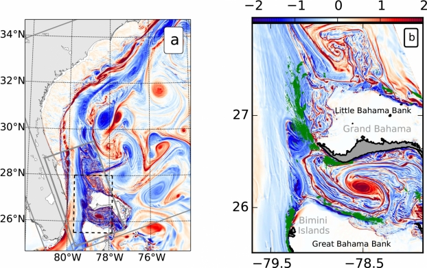 Des chercheurs du Laboratoire d'océanographie physique et spatiale (LOPS/IUEM, CNRS / UBO / Ifremer / IRD) et de l'Université de Californie (UCLA) ont réalisé des simulations numériques réalistes, à des résolutions rarement atteintes, de la dynamique océanique dans la région où le Gulf Stream s'écoule le long de la côte sud-est des USA, entre la Floride et les Bahamas. Ils ont ainsi pu mettre en évidence de nouveaux mécanismes d'interaction des courants avec les fonds marins, lesquels conduisent à la formation de "turbulence" océanique de petite échelle ayant un impact significatif sur le bilan énergétique global de l'océan.
