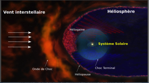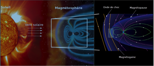 Le vent solaire est un plasma supersonique (flux de particules chargées principalement des protons et des électrons) qui est continuellement émis par le soleil. Le vent se propage dans le milieu interplanétaire et interagit avec les planètes du système solaire. Pour les planètes pourvues d'un champ magnétique intrinsèque, une magnétosphère se forme autour de la planète et agit comme un obstacle s'opposant à l'écoulement du vent solaire. L'interaction vent solaire-magnétosphère génère alors une onde de choc, suivie d'une région très turbulente appelée magnétogaine dans laquelle le vent solaire ralentit, devient plus dense et plus chaud (Figure 1). La turbulence plasma dans le magnétogaine est considérée comme un ingrédient clé pour comprendre les transferts d'énergie et la pénétration des particules du vent solaire dans la magnétosphère, processus responsables de plusieurs phénomènes dynamiques tels que les aurores polaires.
