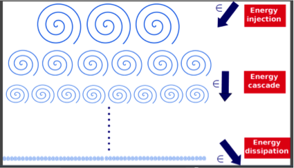 Figure 2: Vue (simplifiée) du processus de cascade turbulence d'énergie des larges échelles (d'injection) jusqu'aux petites échelles (de dissipation) avec un flux constant.