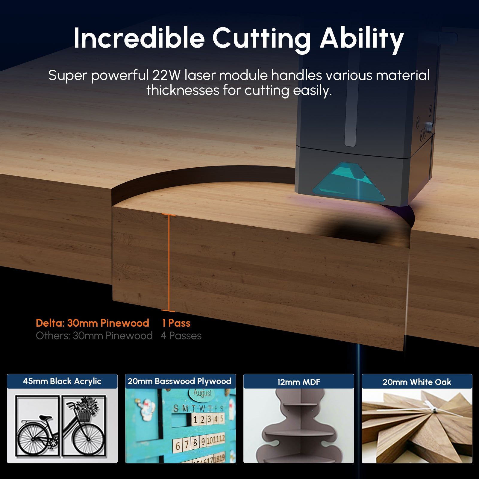 L'Algolaser Delta 22W est un graveur laser doté d'une puissance de 22W. Il est équipé d'un écran tactile tout-en-un et prend en charge la gravure d'images instantanée et la découpe en lots hors ligne. L'appareil est pré-assemblé, ce qui facilite son installation. Il est également compatible avec le Wi-Fi 5G. Il peut graver et découper une grande variété de matériaux, allant du bois à l'acier inoxydable. Il est capable de gérer des épaisseurs allant jusqu'à 30 mm. Le graveur permet également plus de 500 types de gravures en couleur.