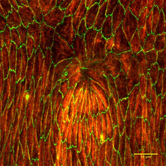 La première surprise a été d'observer que ces embryons se ferment. La seconde a été de constater que la vitesse de fermeture ne diminue pas en l'absence du câble. Le câble ne joue donc pas le rôle dynamique de cordon de bourse qui lui était associé depuis des décennies. Par contre, l'analyse fine en microscopie confocale montre qu'en l'absence de câble, les cellules du bord du tissu sont étirées, compressées et n'adoptent pas leur forme rectangulaire (figure). Ces cellules ne sont pas organisées de manière régulière et la polarité du tissu est perturbée. Lors de la différenciation de l'épiderme, les défauts perdurent et les soies qui recouvrent l'animal sont désorganisées. Ces défauts persistants sont caractéristiques d'une cicatrice.
