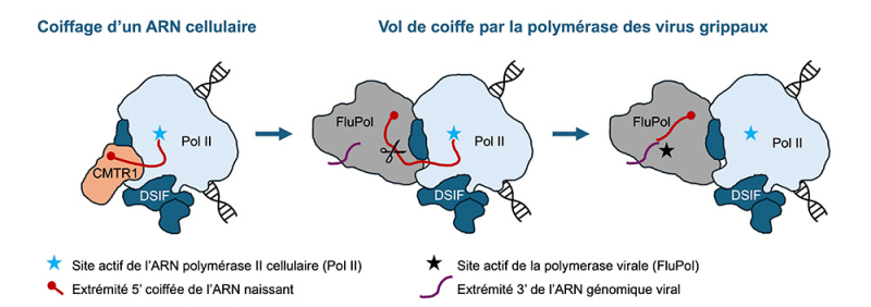 Modèle illustrant le "vol de coiffe" réalisé par la polymérase des virus grippaux (FluPol).