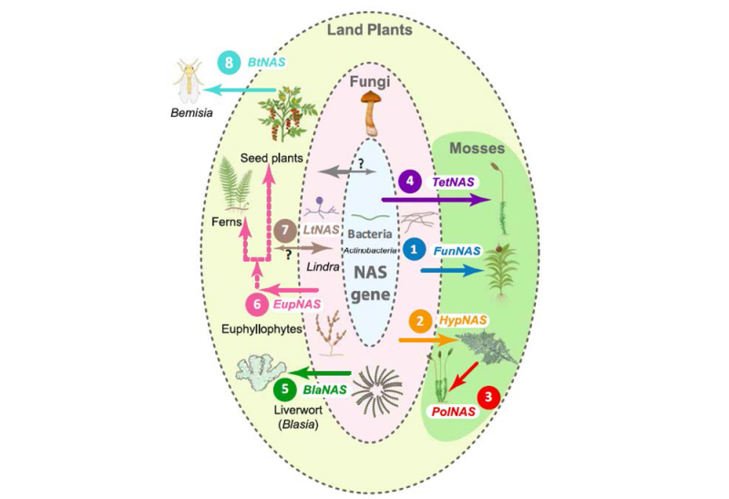Jeder horizontale Pfeil zeigt einen unabhängigen HGT von NAS. Jede NAS wird durch ein präfigiertes Kürzel der Empfängergruppe unterschieden. Beispielsweise zeigt 1 /FunNAS einen Transfer von NAS von einem Pilz auf den Vorfahren einer Gruppe, die die Funariales-Moose umfasst. Im Laufe der Evolution der Moose wurde eine erste NAS (FunNAS; 1) durch eine andere (HypNAS; 2) durch zwei aufeinanderfolgende HGTs ersetzt. Es ist zu beachten, dass Bemisia derzeit der einzige Vertreter der Tiere ist, der eine NAS besitzt. Die Nummerierung gibt nicht die chronologische Reihenfolge der Transfers an.