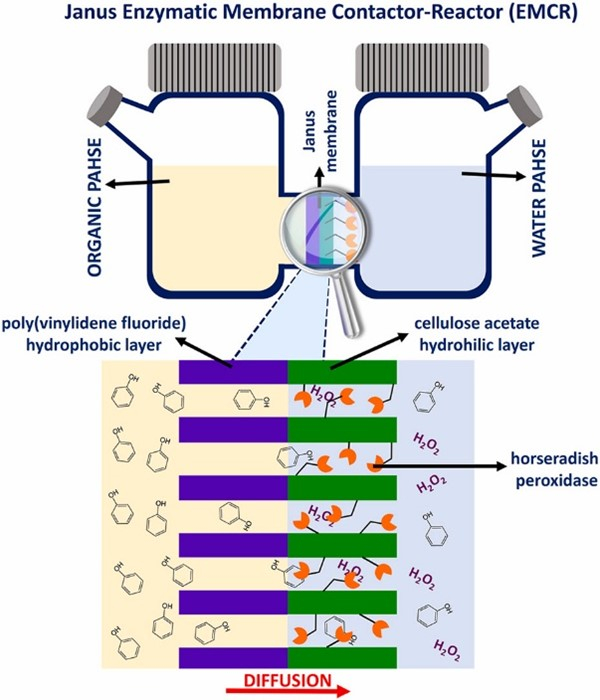 Die Wissenschaftler entwickelten dann eine originelle (Janus-)Membran, die als Grenzfläche zwischen den beiden nicht mischbaren Medien dient: eine hydrophobe Seite für die organische Phase, die die zu entfernenden Schadstoffe enthält, und auf der hydrophilen Seite immobilisierte Enzyme, die in der Lage sind, diese zu eliminieren (Abbildung). Diese Vorrichtung ermöglicht es, die in der organischen Phase vorhandenen COV mit den Enzymen in Kontakt zu bringen, ohne die beiden Phasen mischen zu müssen.