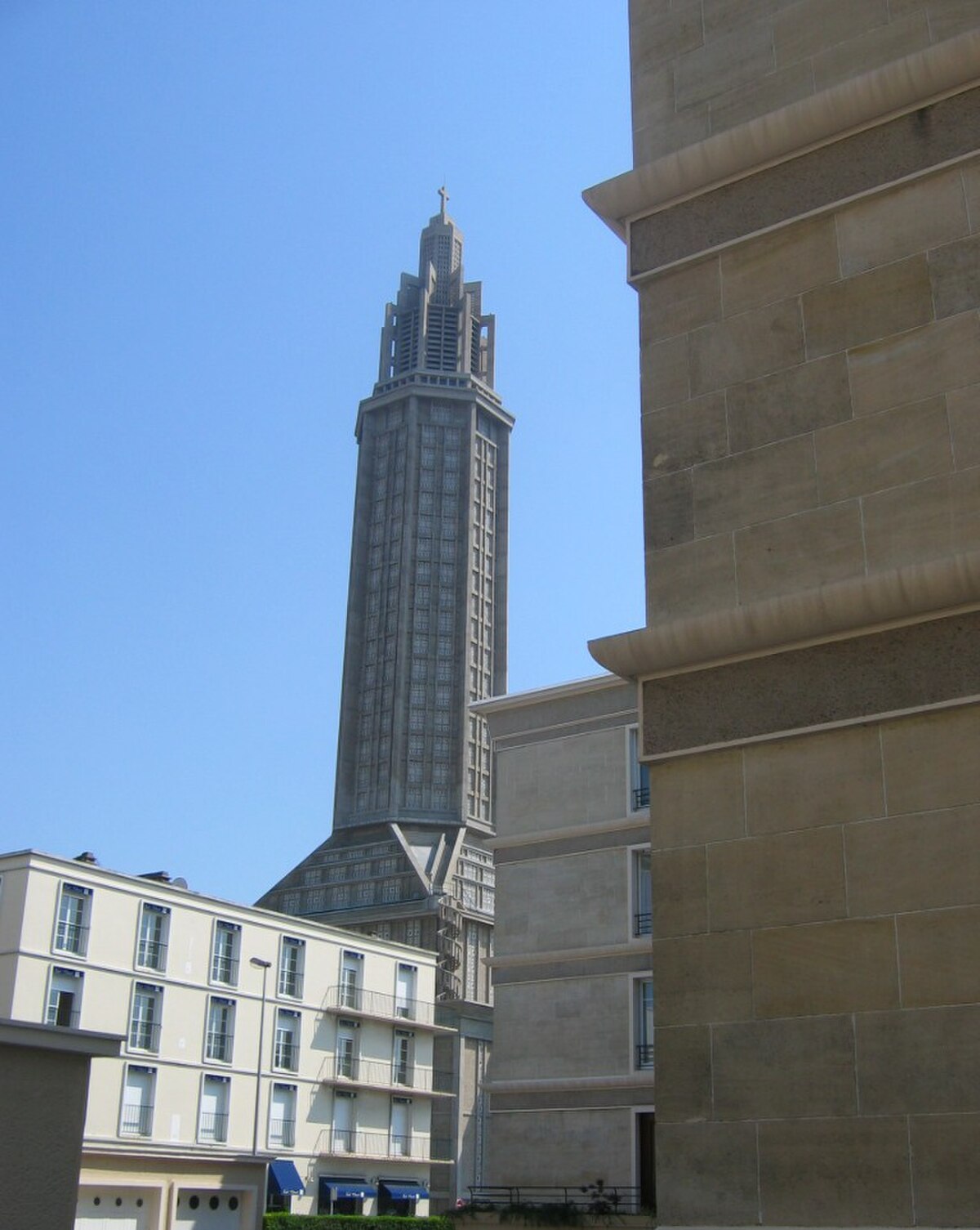C'est le dernier manifeste d'Auguste Perret. La nouvelle église, dessinée de sa main, fut conçue à la fois comme un sanctuaire dédié au culte et un monument honorant la mémoire des victimes de la seconde guerre mondiale. La réalisation de l'édifice fut confiée à Raymond Audigier. À la mort de Perret, en 1954, l'église fut terminée par Georges Brochard qui tenta de traduire ce que désirait réellement son maître pour la forme du clocher. Les travaux débutèrent fin 1951 pour se terminer en décembre 1956 avec l'achèvement de la tour. La nouvelle église Saint-Joseph consacrée en 1964 sera protégée au titre de la loi sur les monuments historiques l'année suivante. L'église a un plan centré en croix grecque et une flèche à base octogonale de 110 mètres de hauteur. La tour-lanterne fait entrer la lumière dans l'édifice grâce à des vitraux multicolores conçus par Marguerite Huré. En 1997, l'église est parée d'un habillage lumineux. D'importants travaux de restauration sont entrepris entre 2003 et 2005. La tribune a été nouvellement dotée de son orgue à tuyaux, inauguré le 25 septembre 2005 avec l'Orchestre des Concerts André Caplet pour la réouverture de l'église.