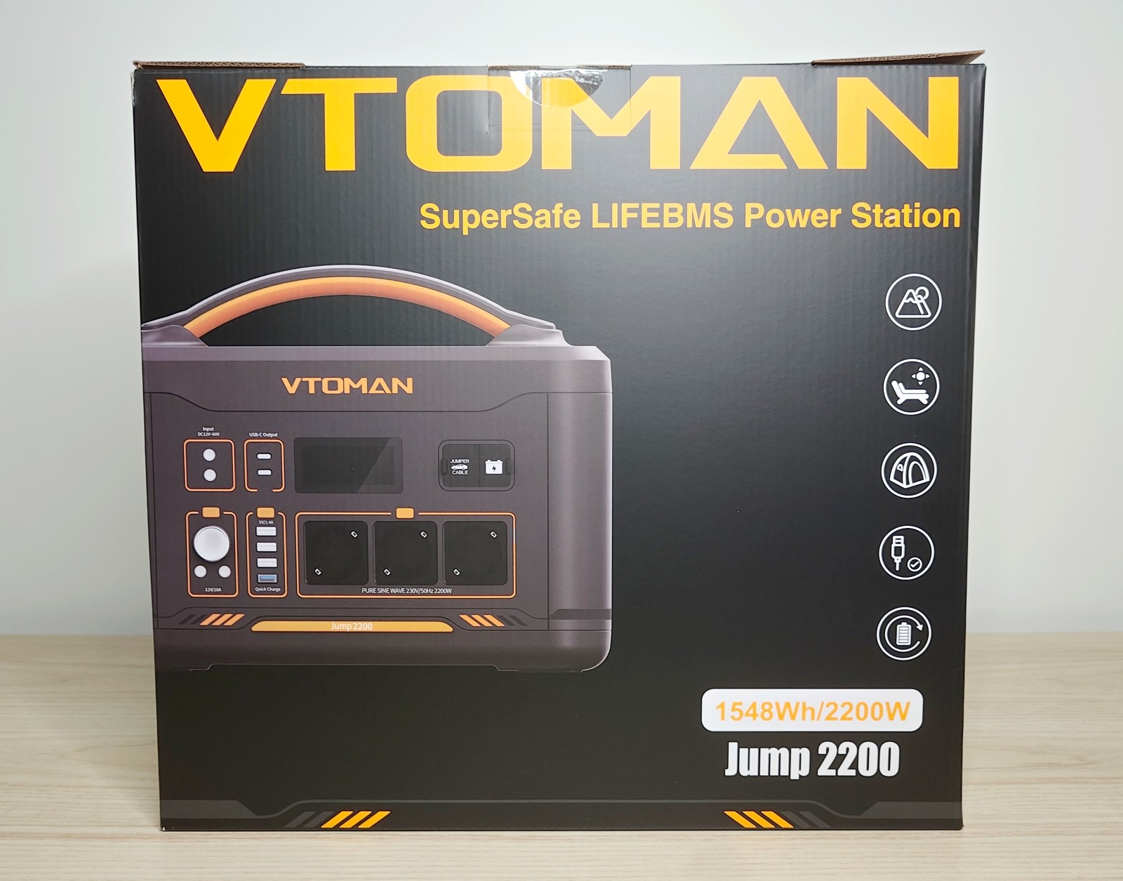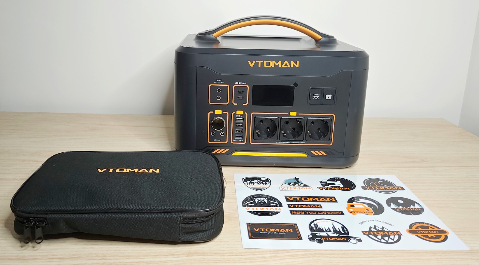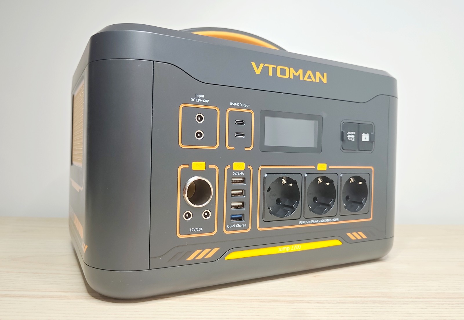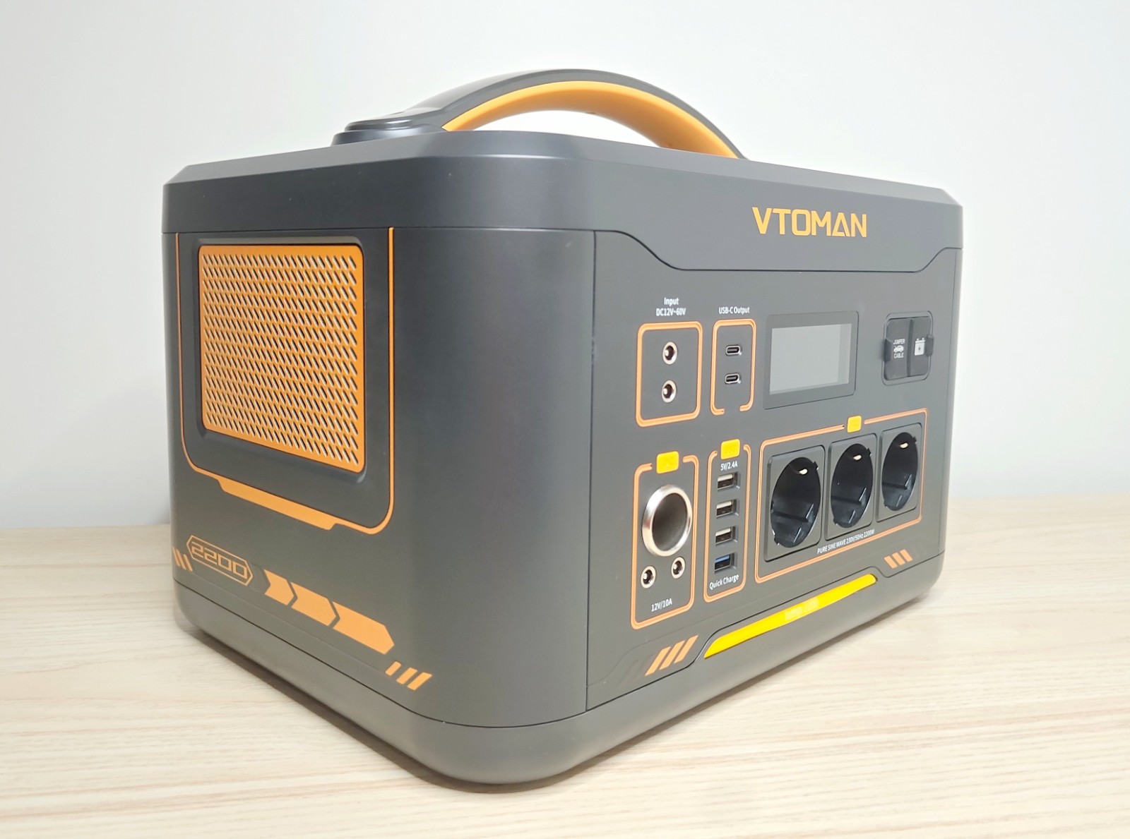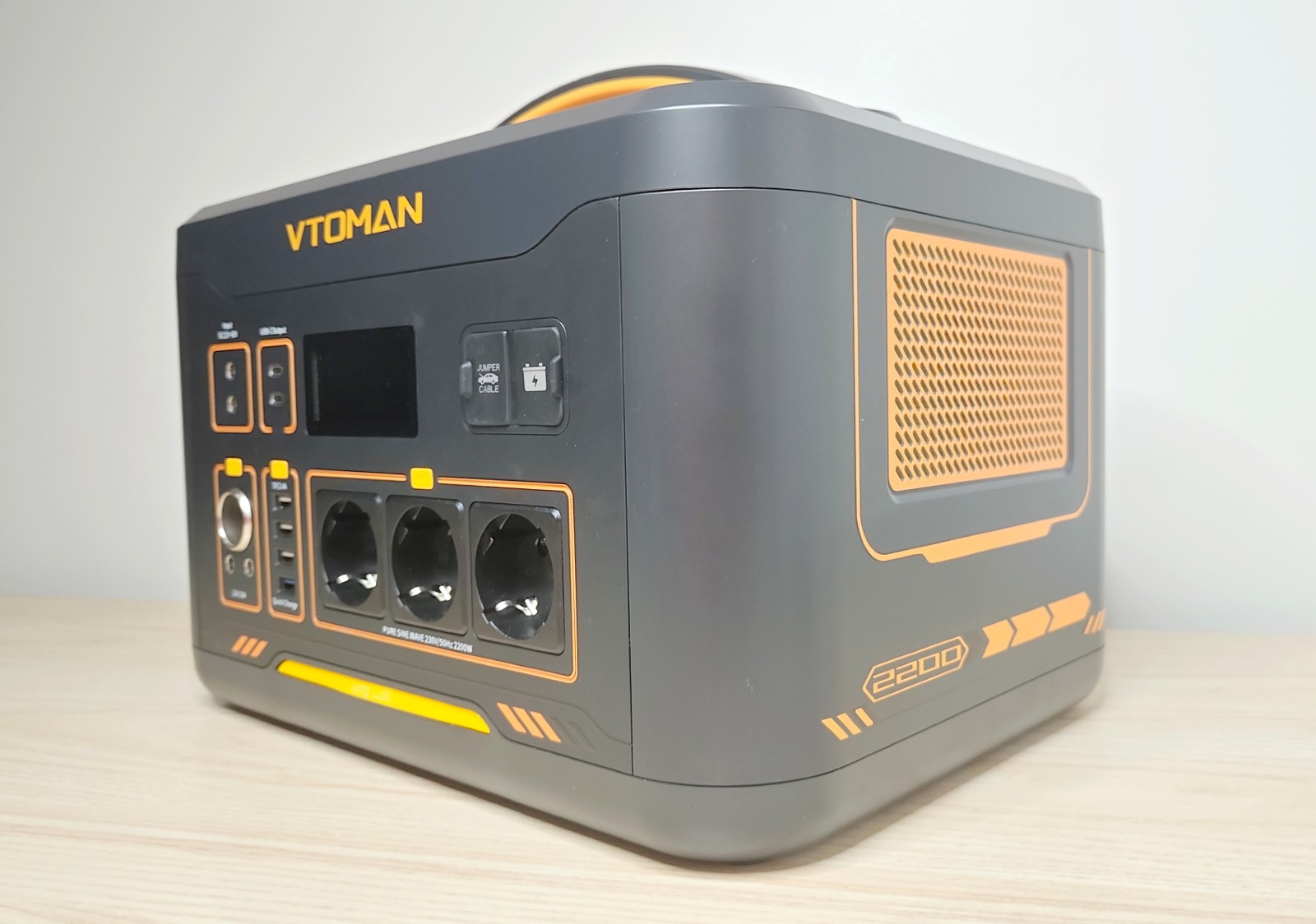 La Jump 2200 adopte une forme rectangulaire compacte, avec des coins arrondis et une large poignée sur le dessus. Le boîtier est en plastique épais gris foncé, avec quelques touches orange qui marquent la gamme VTOMAN. Son poids d'environ 17,4 kg reste raisonnable pour une capacité de plus de 1,5 kWh.