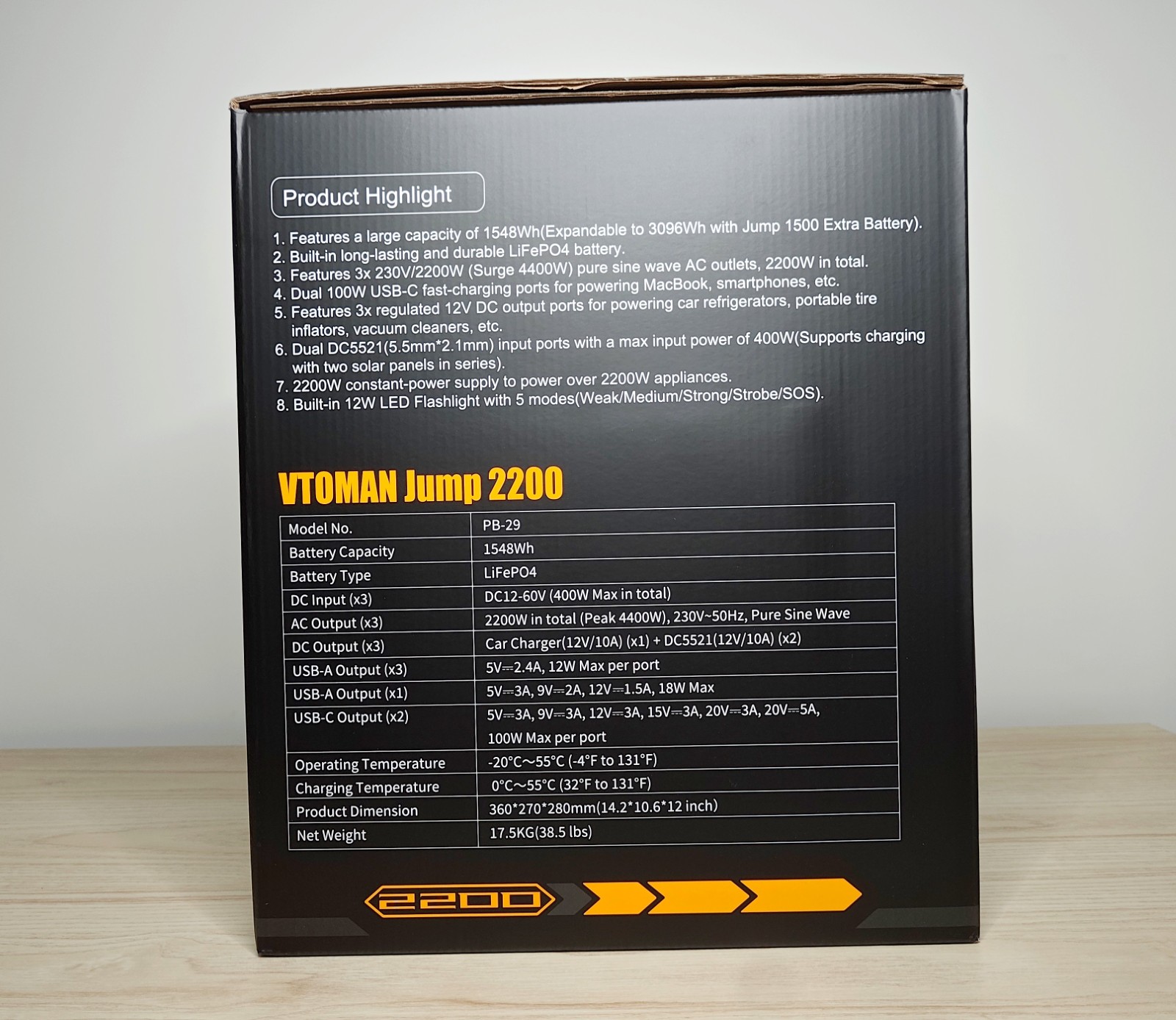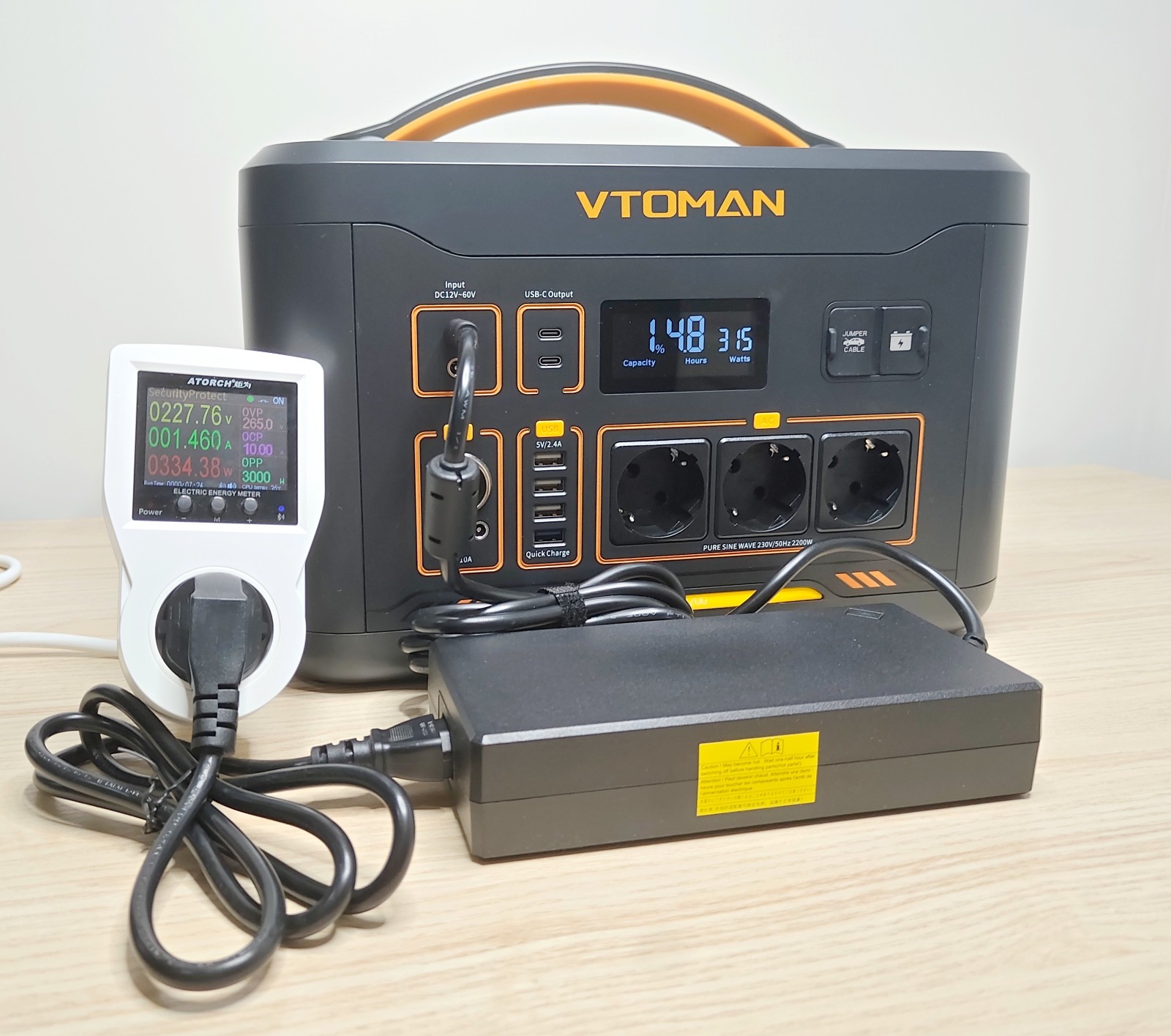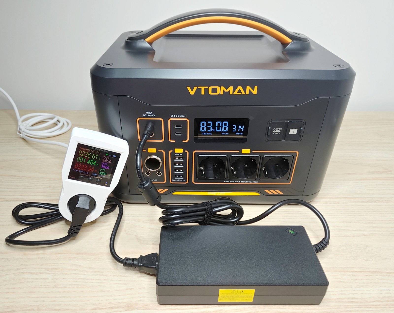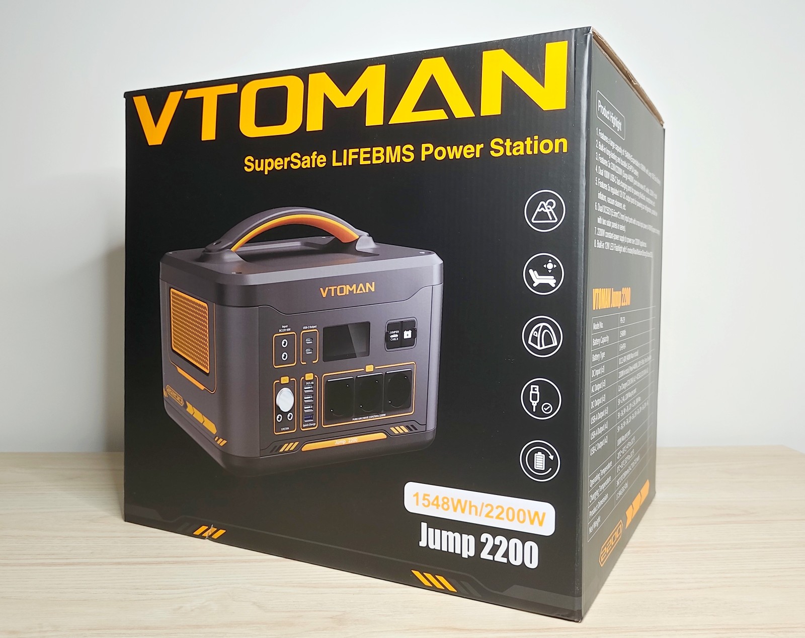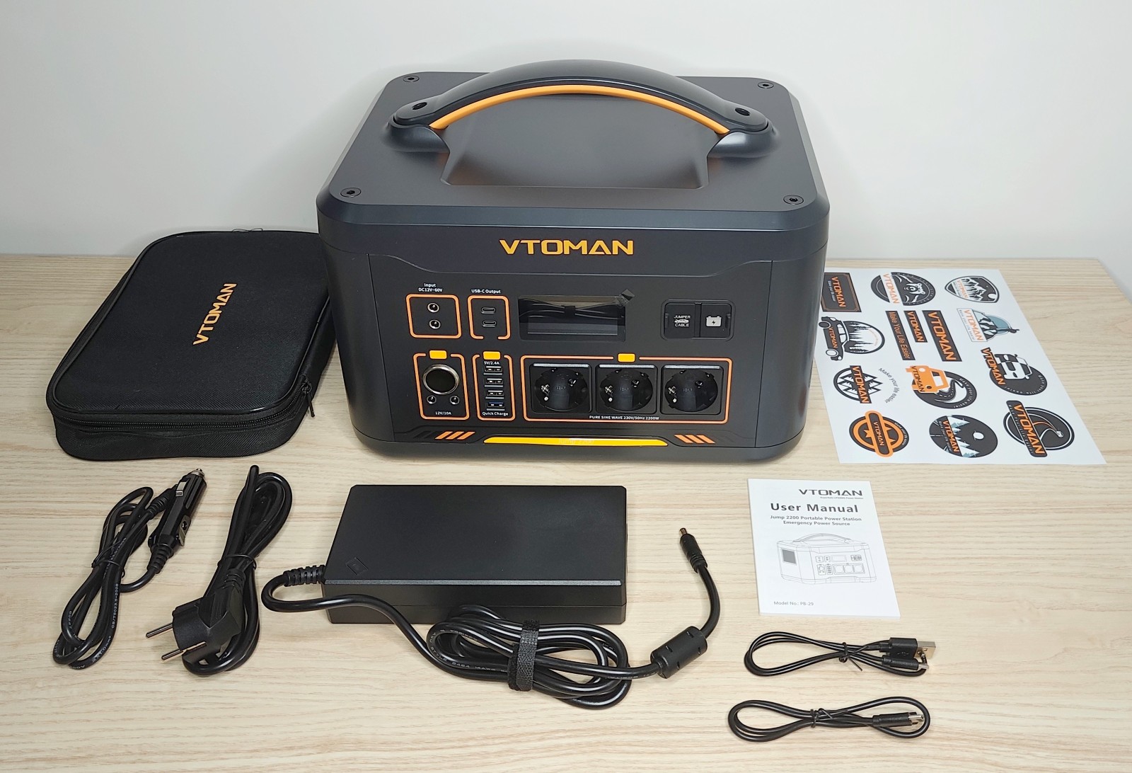 La Jump 2200 adopte une forme rectangulaire compacte, avec des coins arrondis et une large poignée sur le dessus. Le boîtier est en plastique épais gris foncé, avec quelques touches orange qui marquent la gamme VTOMAN. Son poids d'environ 17,4 kg reste raisonnable pour une capacité de plus de 1,5 kWh.