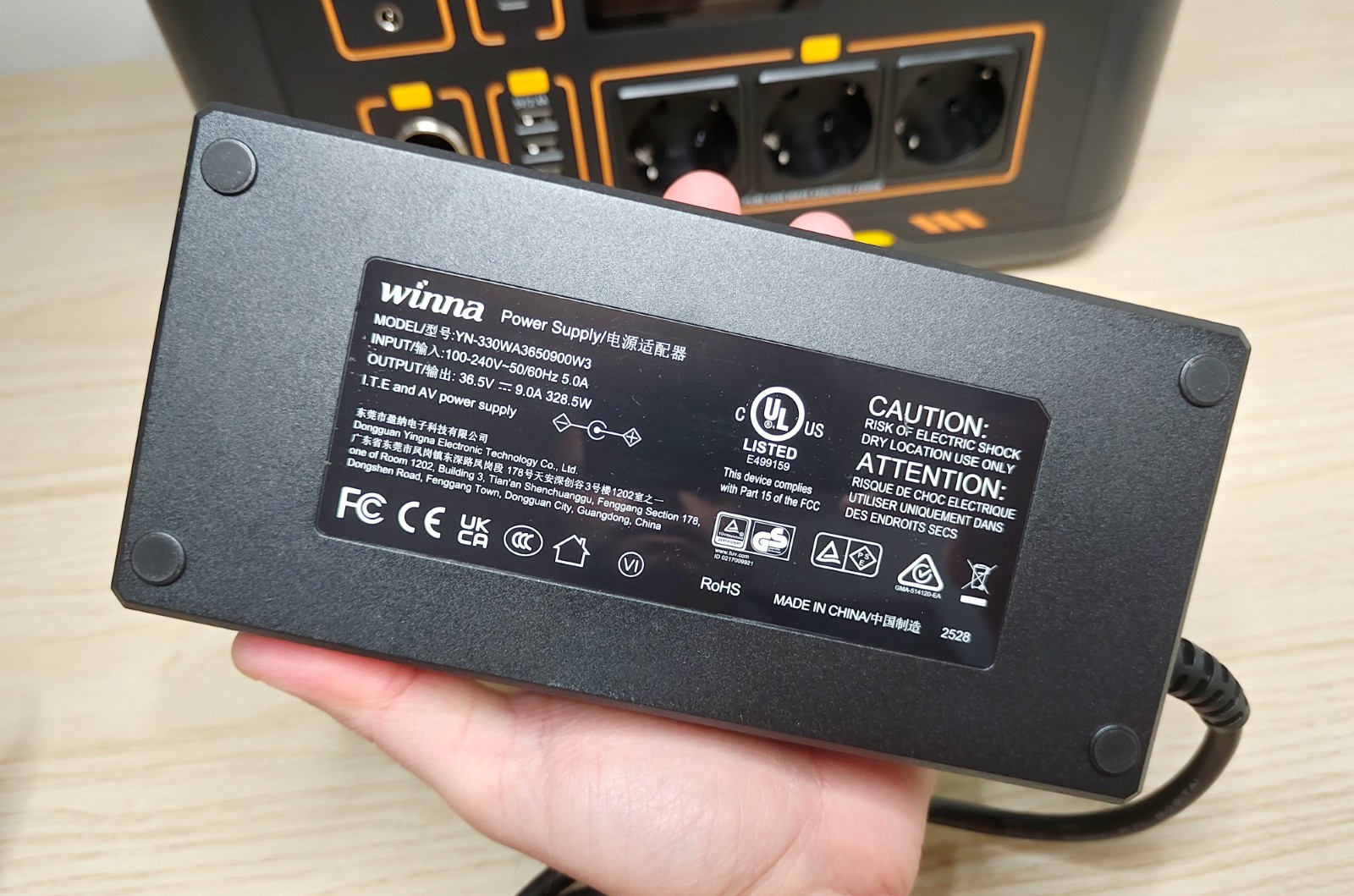 Pour mesurer les performances en charge de la VTOMAN Jump 2200, nous avons vidé complètement la batterie avant de lancer une recharge complète à l'aide du chargeur fourni. Ce dernier est un bloc externe affichant une puissance de sortie de 328.5 W. Ce choix technique présente à la fois des avantages et des inconvénients, notamment une diminution du poids de la station si on ne souhaite pas s'encombrer du chargeur, mais cela implique aussi un deuxième élément a déplacer dans le cas contraire. La station ne peut pas se brancher directement au secteur sans ce bloc.