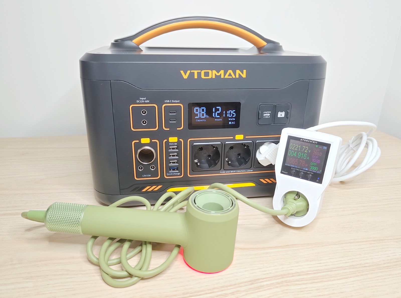 Pour ce test de décharge, la VTOMAN Jump 2200 a été utilisée depuis un niveau de charge de 100 % avec un appareil électrique gourmand: un sèche-cheveux affichant une consommation stable d'un peu plus de 1000 W. Ce type d'appareil constitue un bon moyen de tester la capacité utile réelle de la batterie. La puissance affichée par l'écran de la station est restée stable, sans coupure ni alerte, pendant toute la durée de l'essai. C'est une bonne indication sur la
