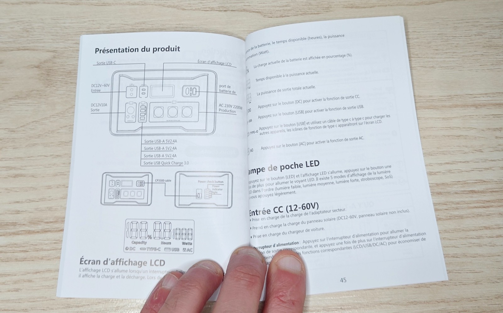 - Écran LCD central : il affiche la capacité restante, la puissance d'entrée et de sortie, ainsi qu'une estimation du temps restant en charge ou décharge.