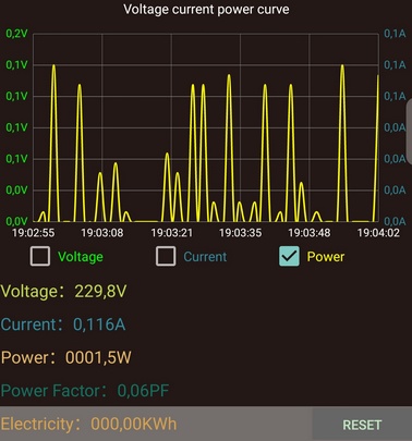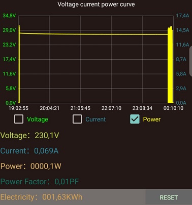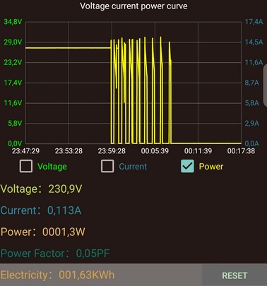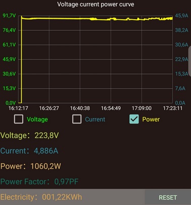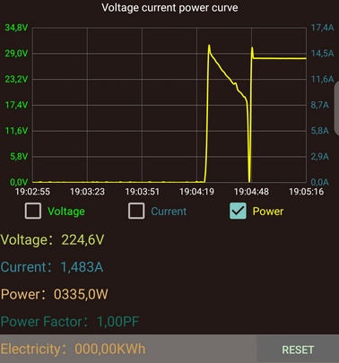 Au début de la recharge, on observe pendant les premières 30 secondes une montée rapide de la puissance consommée, puis une descente progressive jusqu'à 0 et enfin une remontée et stabilisation à environ 330 W. Ce comportement s'explique sans doute par une gestion de la recharge au tout début du cycle. En fin de compte, la puissance se stabilise.