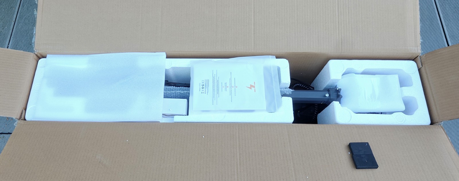L'ouverture du carton se fait sans difficulté particulière, un cutter suffit. Une fois les rabats retirés, on accède directement aux éléments principaux, bien organisés. Plusieurs blocs de polystyrène et de la mousse dense viennent caler la trottinette. Le cadre, la colonne de direction et les roues sont solidement immobilisés. Les accessoires sont eux aussi bien calés, dans des espaces aménagés sur mesures.