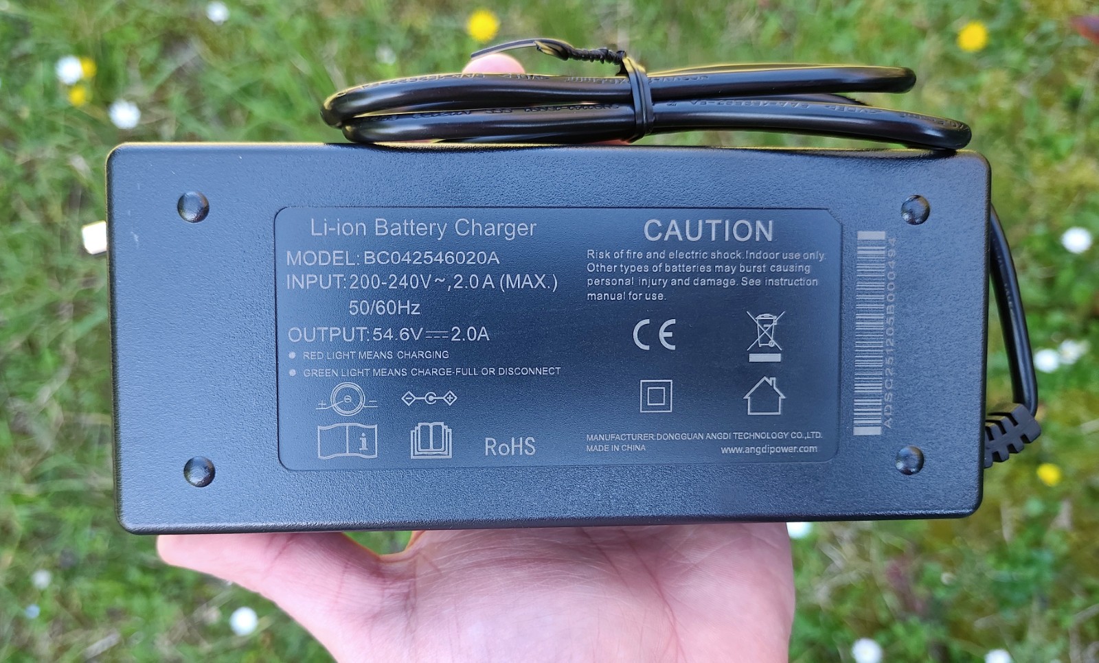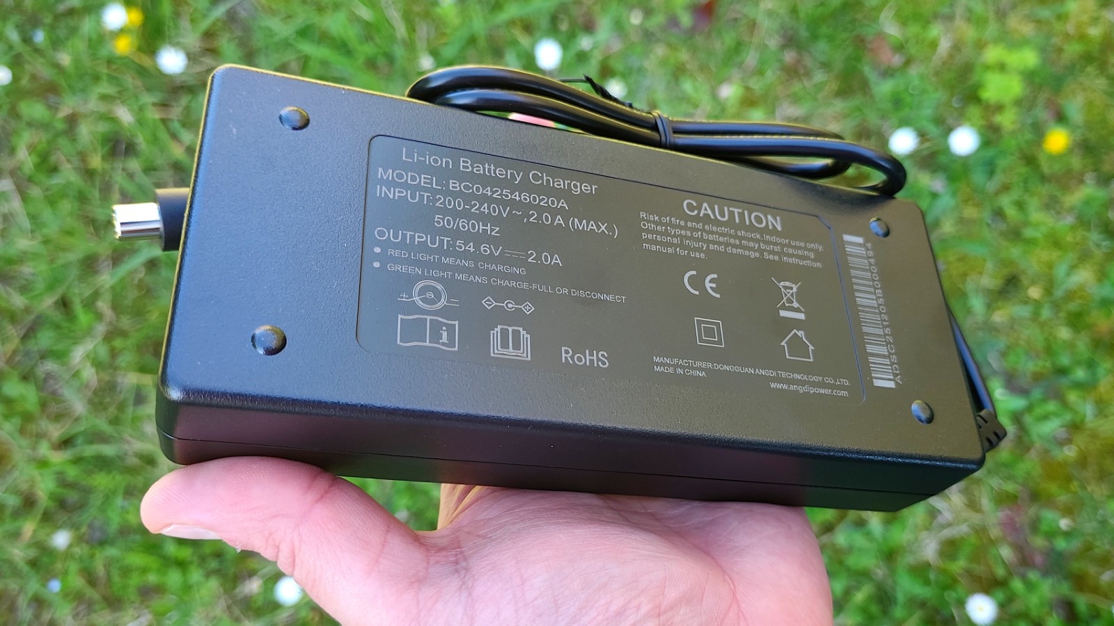 Le chargeur est plus compact que la moyenne, ce qui est une bonne chose quand on sait qu'il doit charger une grosse batterie de 18 Ah. Il fournit 54.6V pour 2.0 A, soit près de 110 Watts.