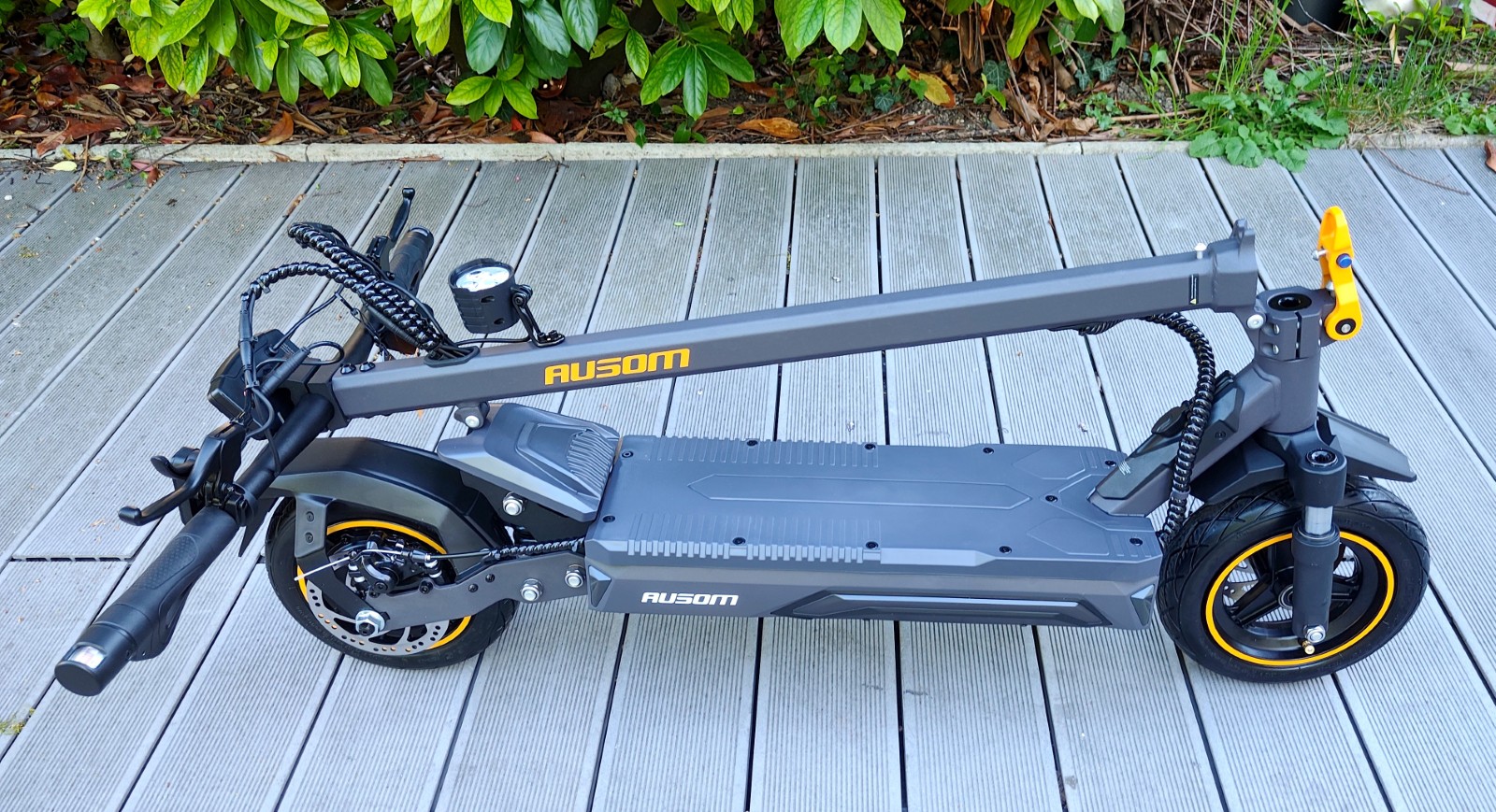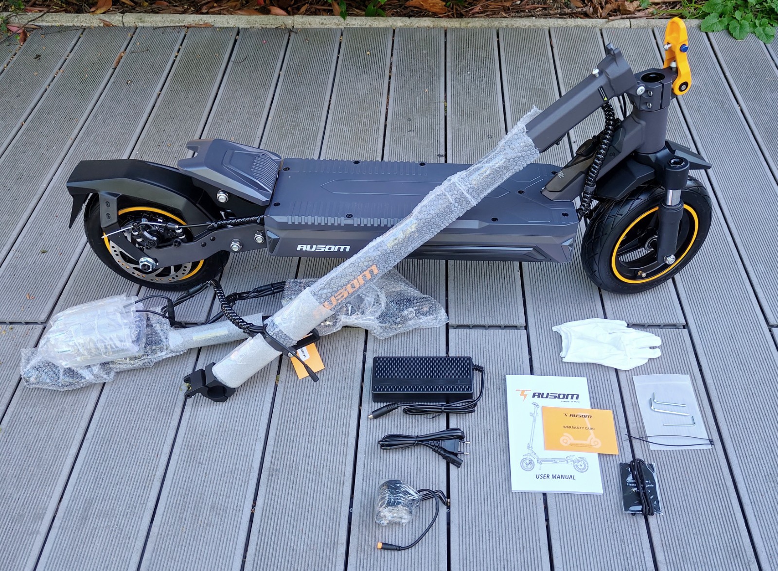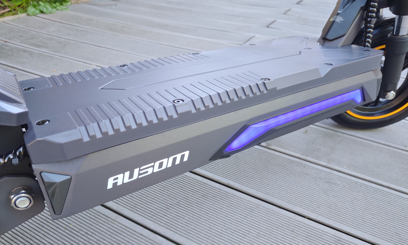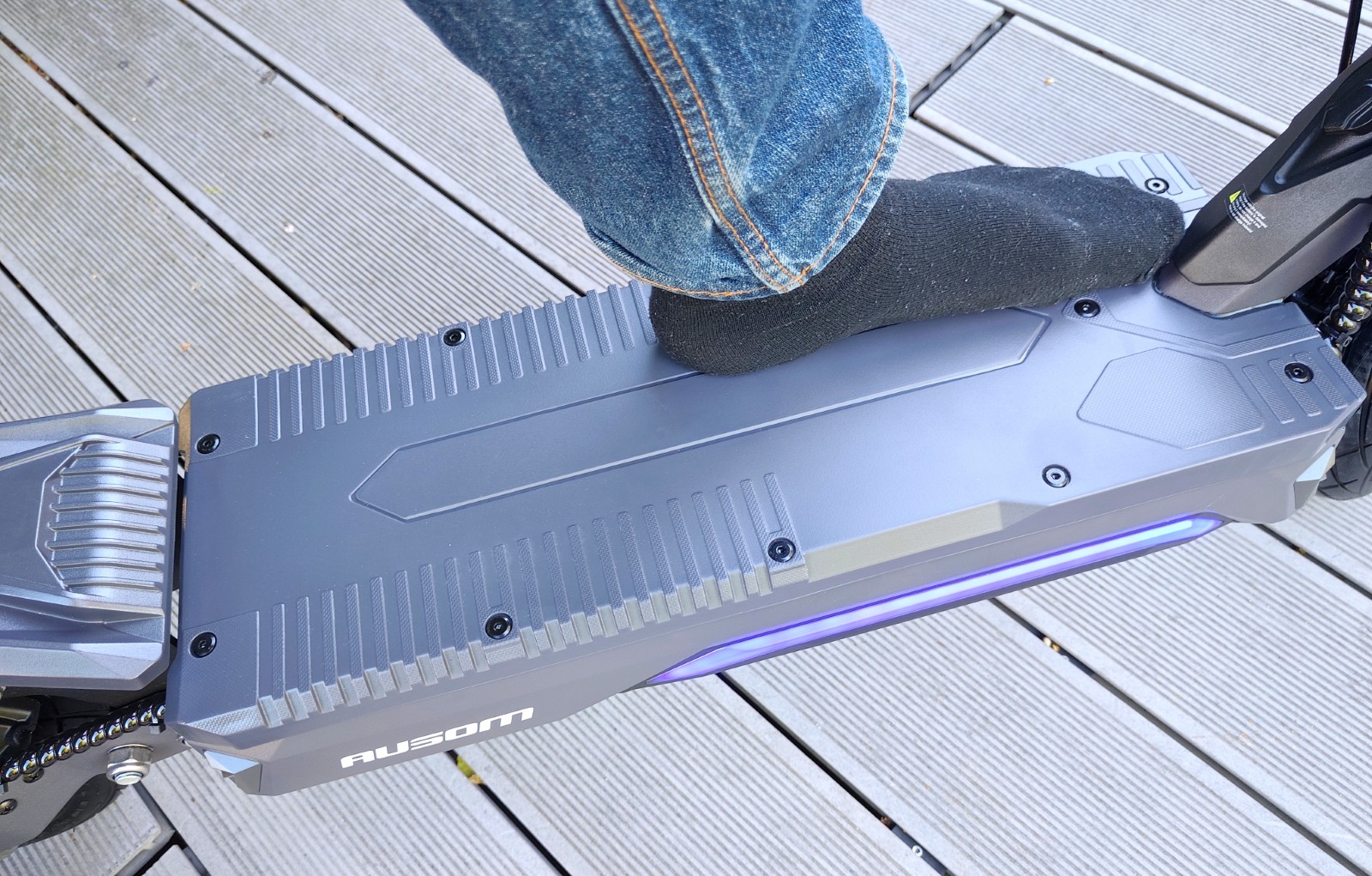 La Ausom K20 Pro donne une impression de solidité. Le châssis est rigide, avec des soudures propres et des éléments bien ajustés. Avec 26.4 kg, le poids se fait sentir sans être excessif, il participe à cette sensation de robustesse. Le deck est large, ce qui est en rapport de la grosse batterie qu'il contient: 18 Ah.