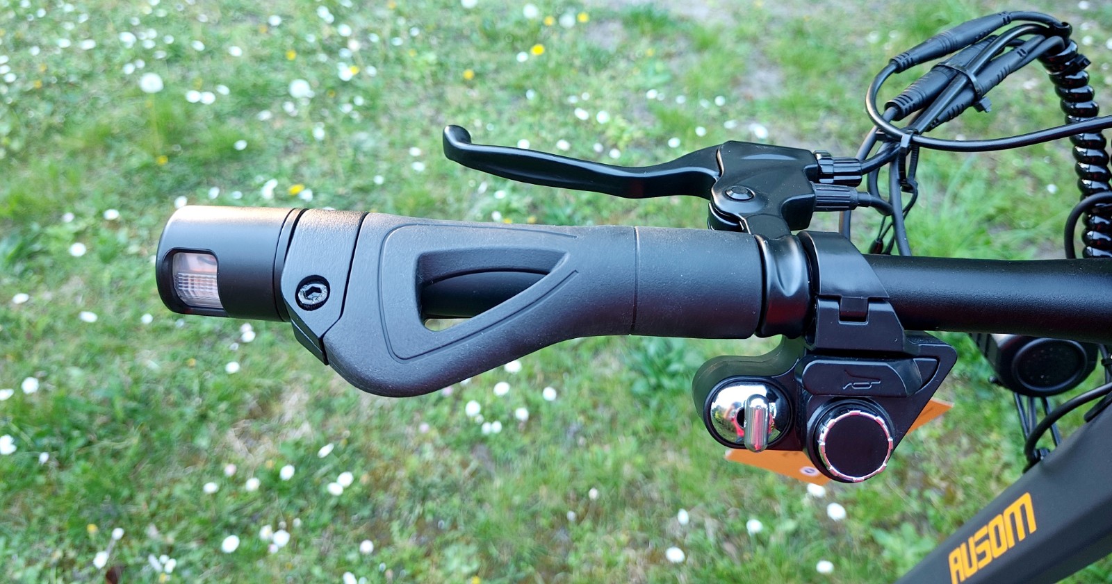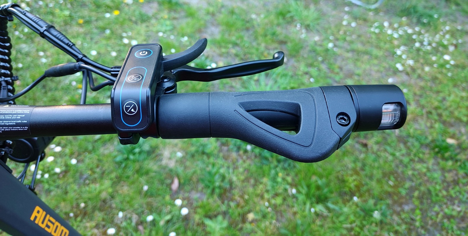 Les équipements du guidon sont bien réparties: l'accélérateur est un levier au niveau de l'index droit, au même niveau que les boutons de commandes. Le bouton des clignotants ainsi que le klaxon électrique se trouvent à gauche.