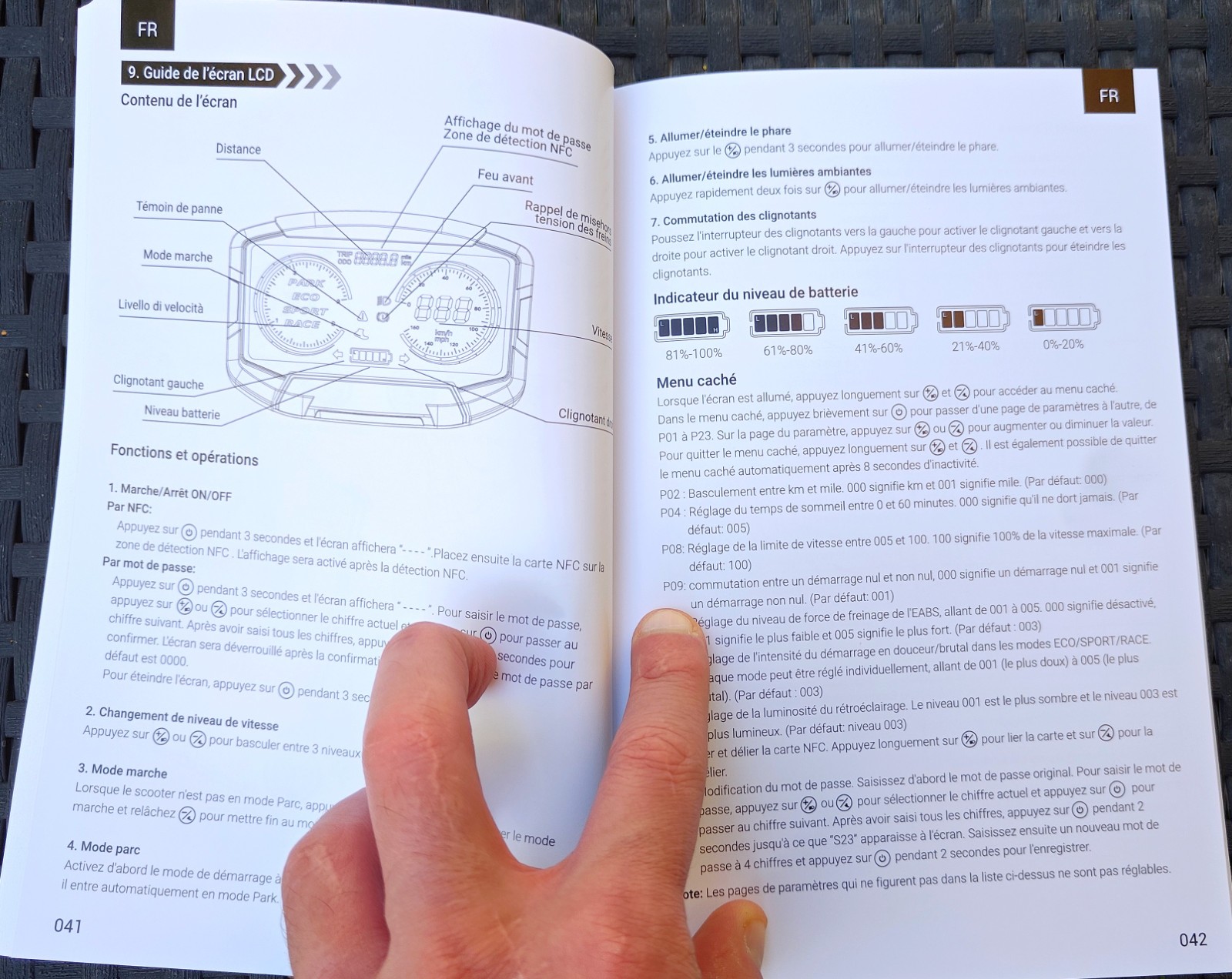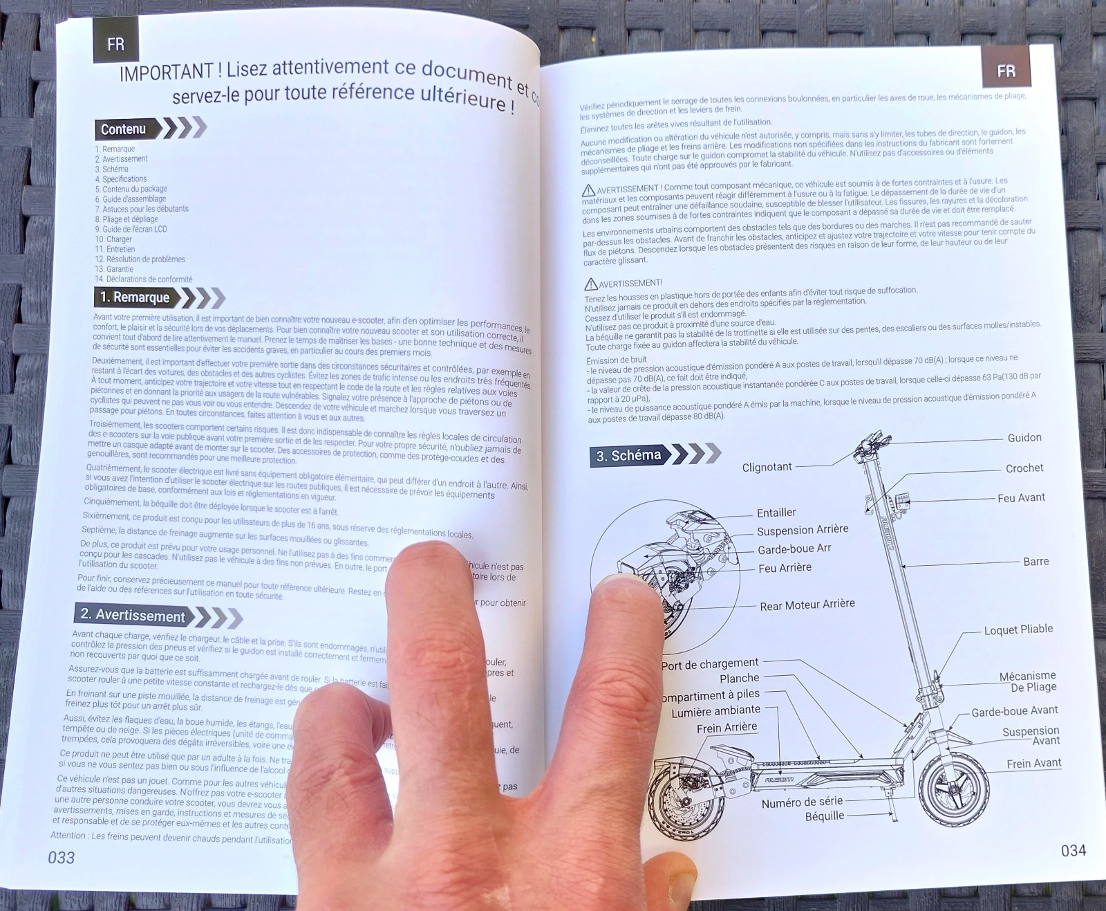 En éléments supplémentaires, on retrouve le chargeur et les outils nécessaires au montage. La notice est également présente, avec une section en français et des indications illustrées. Y compris pour accéder au 'menu caché'. Notez que cette trottinette est livrée conforme aux normes européennes, mais débridable via les menus et un code pour une utilisation hors voies publiques.