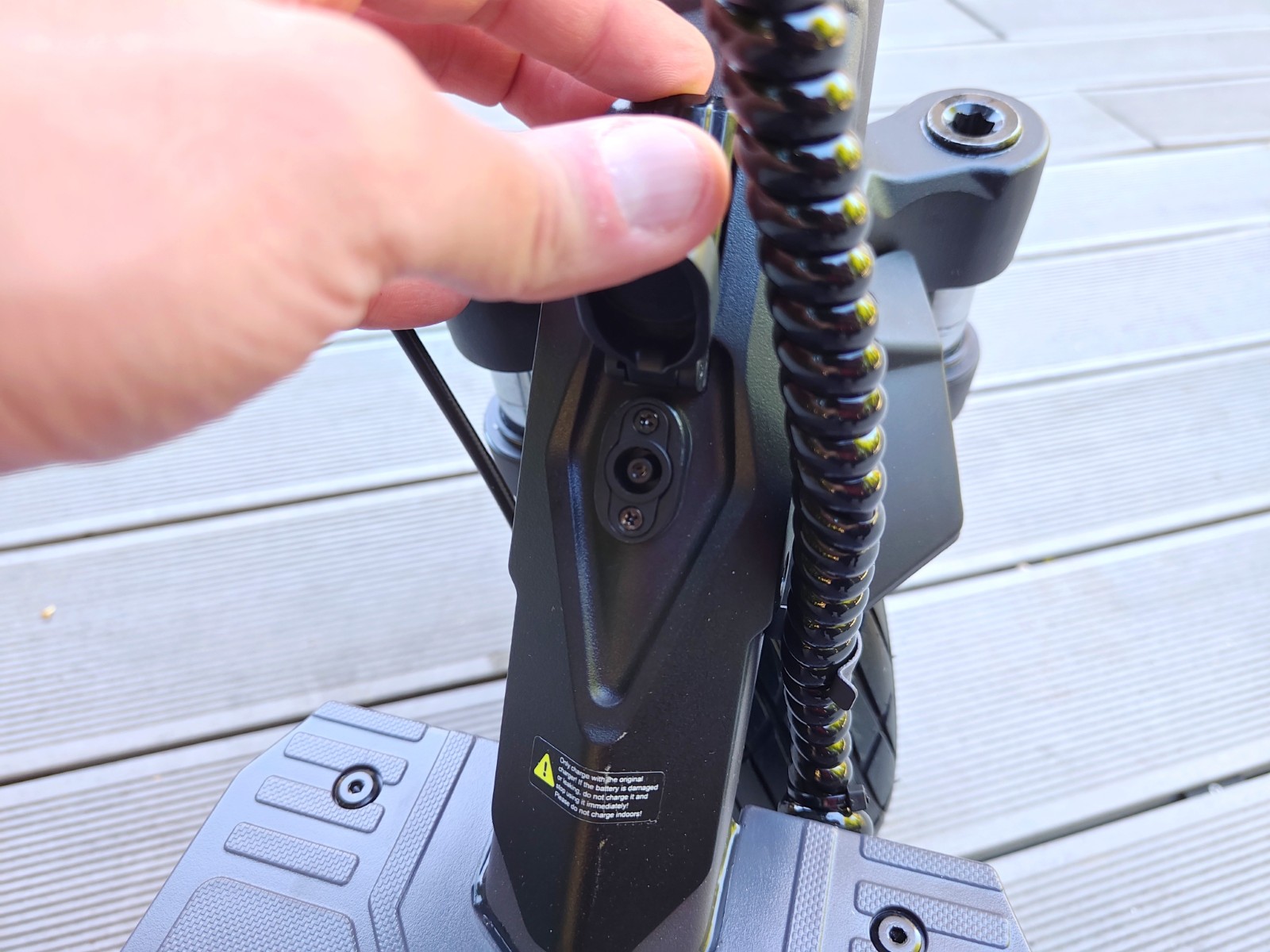Un repose-pied relevé est présent à l'arrière mais il n'est pas indispensable: vous pourrez sans problème poser vos deux pieds à plat. La prise pour le chargeur se trouve dans la liaison du deck à la potence: un bon point, elle est à la fois très accessible tout en restant relativement protégée des salissures et éclaboussures.