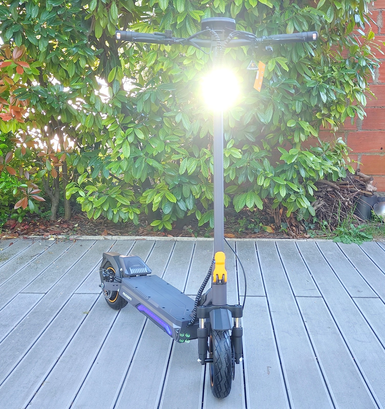 Le confort constitue un point marquant. Les suspensions avant et arrière associées aux pneus de 10 pouces absorbent efficacement les irrégularités. Cela se ressent particulièrement sur routes dégradées ou pavées. Le deck large et la position de conduite naturelle renforcent cette sensation. Sur ce point, la trottinette se montre clairement adaptée aux trajets réguliers et aux longues distances.