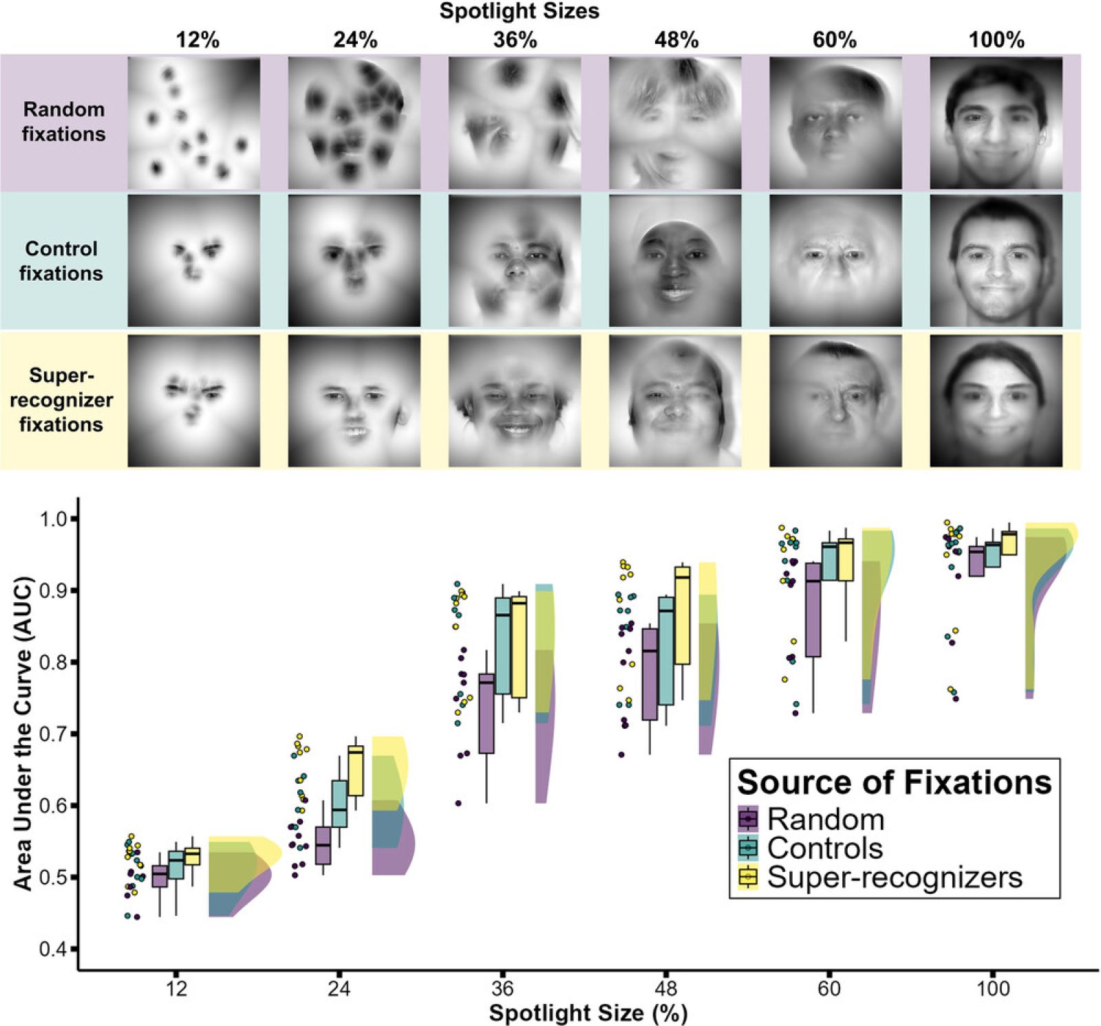 Super-recognizers exploit higher computational values in retinal information during a face learning task. Examples of composite images for each projection size and each type of information sampling are presented in the top panel. The bottom panel illustrates identity matching accuracy (AUC scores) for nine deep neural networks (DNNs). For six projection sizes, matching accuracy was higher with information sampled by super-recognizers compared to that sampled by typical users or generated randomly.
