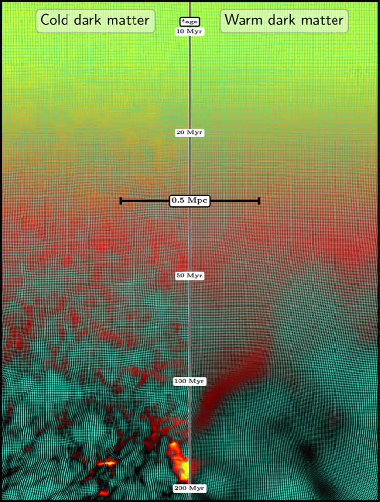 Comparación de los escenarios de materia oscura fría (izquierda) y caliente (derecha) mostrando la evolución de las estructuras gaseosas durante las Edades oscuras cósmicas