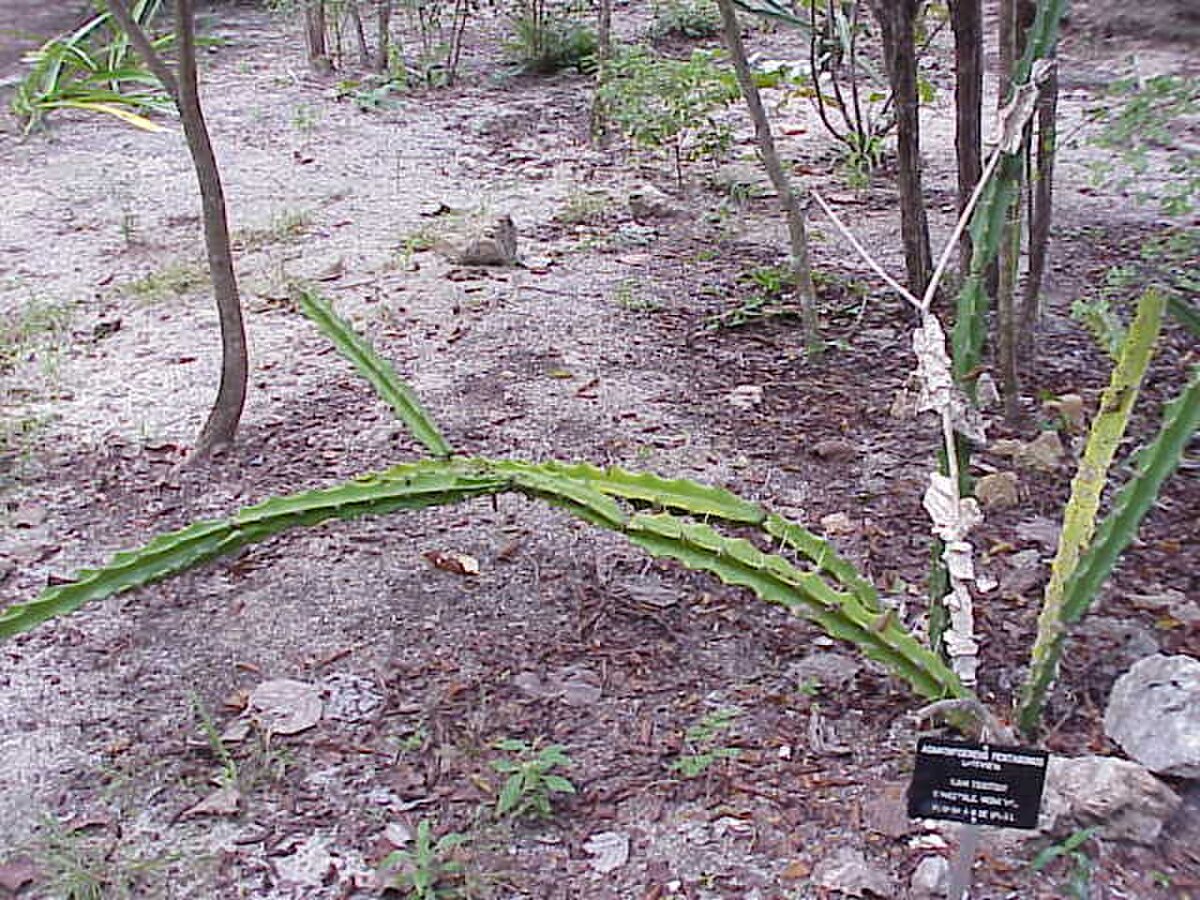 Les tiges ont de 3 à 5 cotes aplaties, avec de fortes épines. Les fleurs blanches en forme d'entonnoir sont nocturnes, de 12 à 25 cm de long et 6 à 12 cm de diamètre.