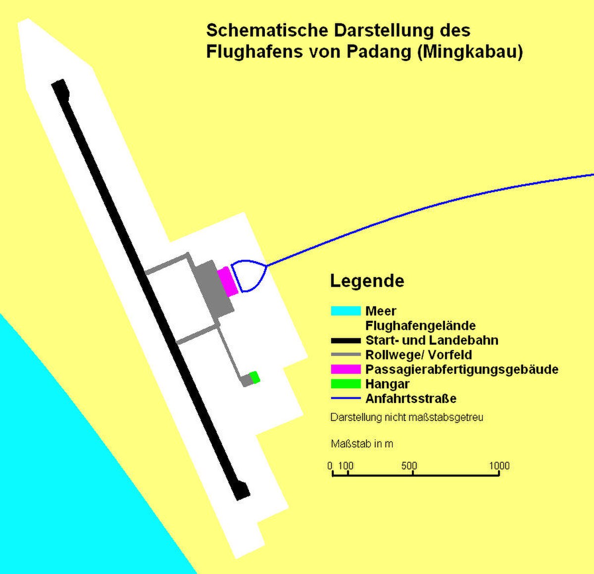 L'aéroport couvre une superficie de 427 hectares et possède une piste orientée 15/33 de 2 750 m x 45 m. Il est prévu de porter la longueur de la piste à 3 000 m pour accueillir des Boeing 747 et de relier l'aéroport à Padang par une voie ferrée.