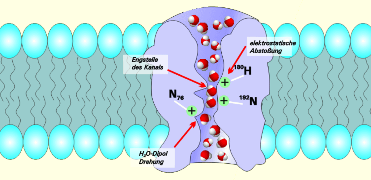 Selon les modélisations informatiques, ces molécules, lorsqu'elles entrent dans l'entonnoir du pore (canal hydrique) formé par 4 aquaporines, sont progressivement alignées alors que le pore se rétrécit (le pore a une forme de sablier). Les forces électrostatiques faibles résultant de la configuration interne du pore positionnent alors chaque molécule d'eau dans une même position : atome d'oxygène en premier. Arrivée au centre du canal chaque molécule d'eau est individuellement happée par l'attraction chimique de certains acides aminés qui tapissent l'intérieur du pore. Elle est ensuite retournée sur elle-même (par interaction avec deux asparagines présentes à l'entrée de l'étranglement). Ce retournement brutal de la molécule casse pour un instant la liaison hydrogène, isole la molécule du flux cohérent de la file des molécules d'eau, et la pousse vers la sortie du pore (cette fois les atomes d’hydrogène positionnés vers la sortie). Seule les molécules d'eau et certains solutés passent ce type de "porte". Les ions hydrogène (ions hydronium en solution aqueuse parfois appelés protons) qui constituent la réserve énergétique de la cellule sont eux repoussés bien que plus petits et solubles dans l'eau ; ces pores sont totalement étanches aux protons, permettant aux cellules de conserver leur potentiel électrochimique.