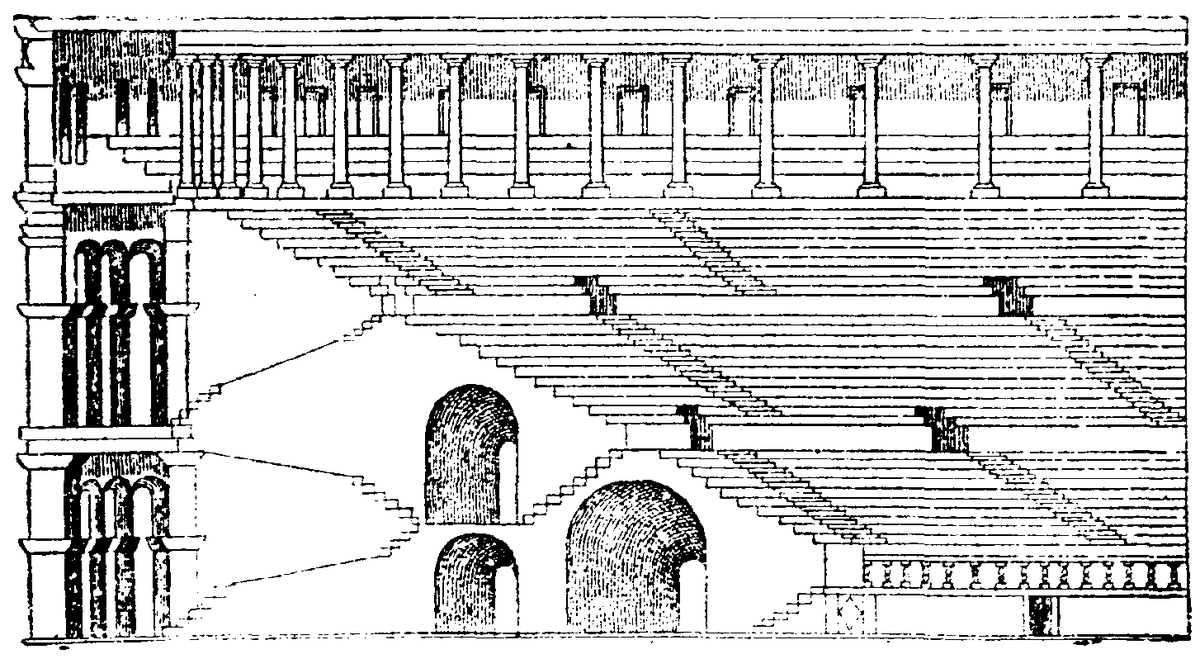 Les gradins sont disposés en hémicycle autour de l'orchestre et devant la scène. Les accès aux gradins se font par en dessous, en utilisant le réseau de galeries couvertes en voûte d'arêtes concrète appelé vomitoire (vomitorium), qui évitent de mettre en contact les différentes classes sociales. L'accès au théâtre grec antique se fait par les gradins.
