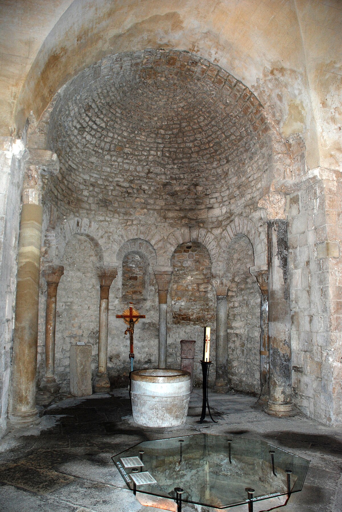 Le baptistère contient une cuve baptismale octogonale décentrée.
