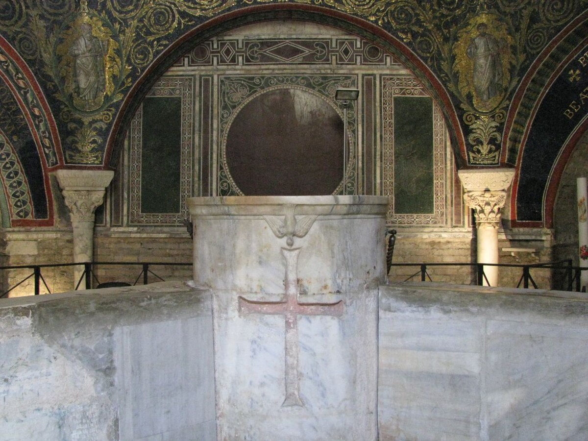 Le baptistère possède une vasque monumentale et octogonale, utilisée pour baptiser le fidèle par immersion presque totale.