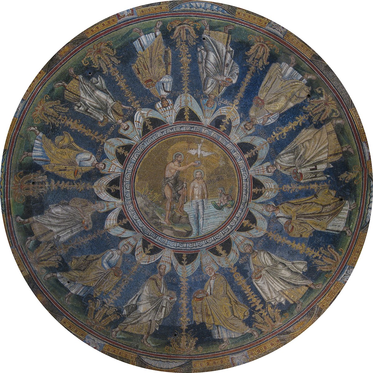 Le centre de la coupole est occupé par une mosaïque qui représente le baptême du Christ dans les eaux du Jourdain par saint Jean-Baptiste. Ainsi le fidèle peut identifier son baptême à celui du Christ. On remarque dans cette scène une allégorie curieusement païenne du Jourdain.