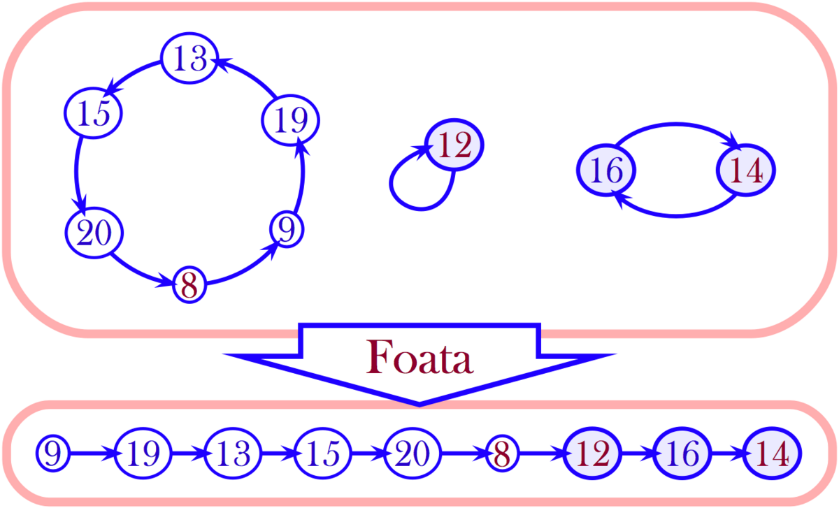 On peut alors appliquer la correspondance de Foata à la restriction de ƒ à C, que nous noterons τ, et obtenir ainsi un arrangement (une suite ordonnée) ω de tous les éléments de C. La correspondance de Foata consiste à écrire la suite des cycles de la décomposition en cycles disjoints de τ, en prenant bien soin :