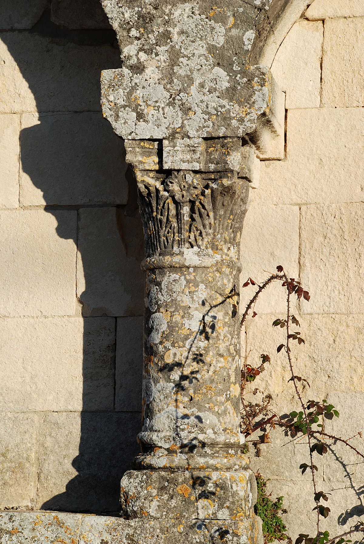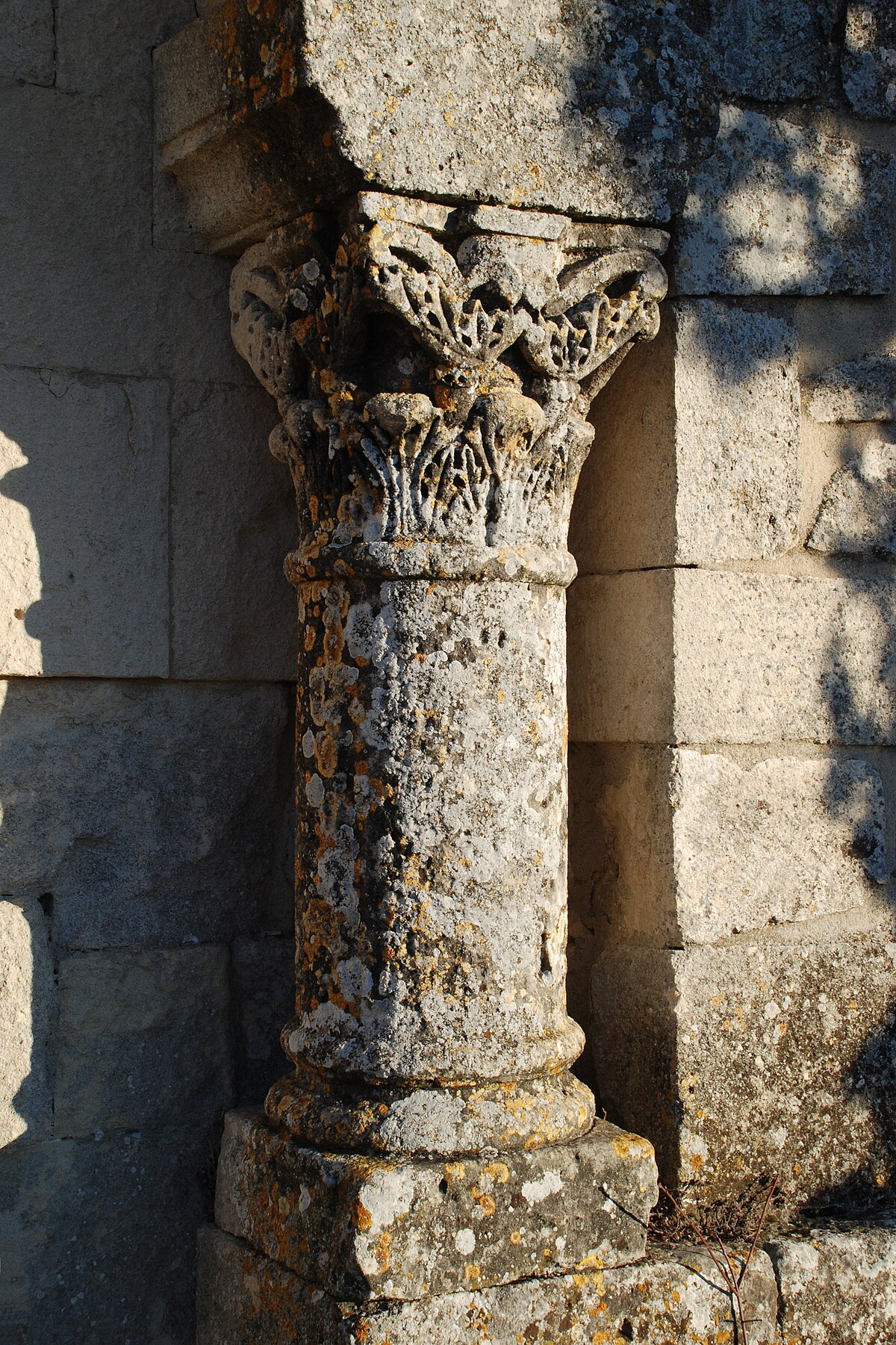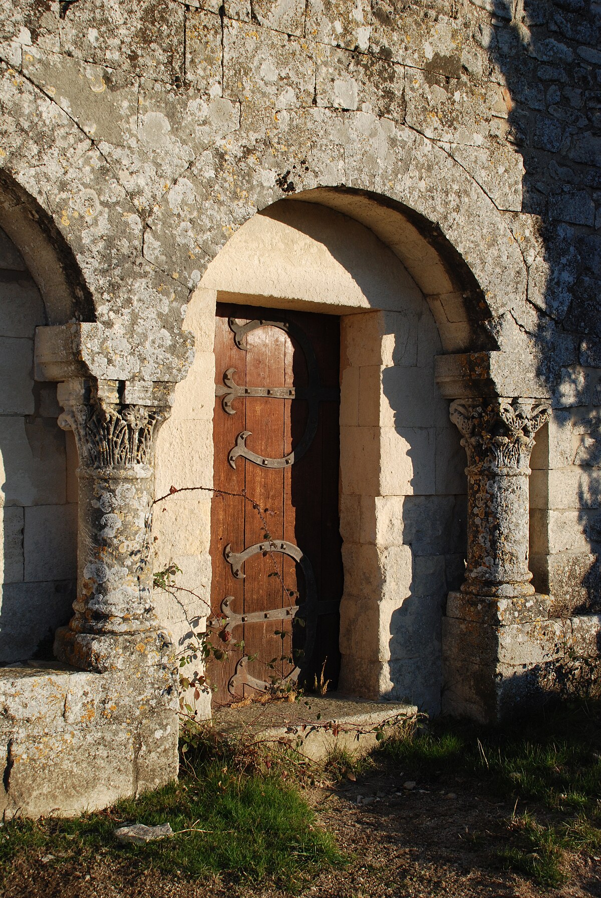 Le chapiteau de la colonne située à droite de la porte est orné de feuilles d'acanthe alors que le chapiteau de la colonne de gauche est orné d'une fleur encadrée de palmettes.