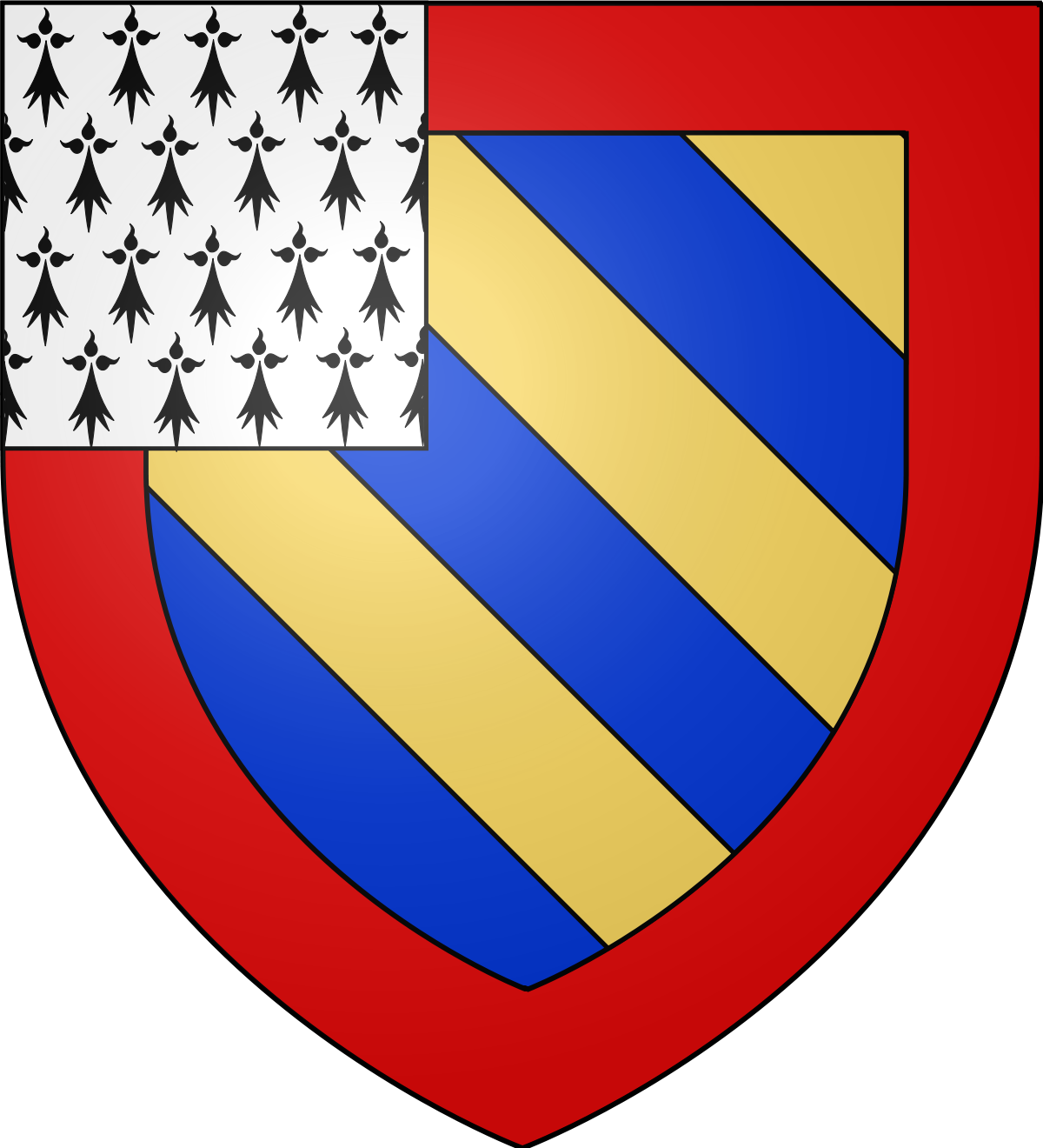 Maison capétienne de Bourgogne (rameau de Montagu) : Bandé d'or et d'azur de six pièces, à la bordure de gueules et au franc quartier d'hermines.