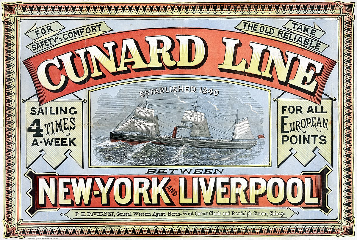 En 1840, le premier navire à vapeur de la Cunard, le Britannia, commence à naviguer entre Liverpool et Boston, marquant le début d'un service régulier avec des navires à vapeur pour les passagers et les cargaisons. La Cunard doit faire face à de nombreux concurrents au Royaume-Uni, en France, aux États-Unis et en Allemagne, mais elle reste un des leaders du marché des transatlantiques.
