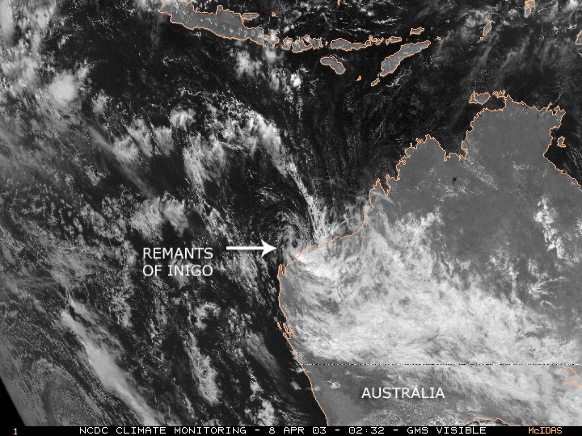 Comme Inigo avait perdu considérablement de sa forte en atteignant la côte australienne, les stations côtières n’y rapportèrent que des vents de tempête (64 km/h). La quantité de pluie près du point de contact avec la terre se monta à 226 millimètres, dont 128 tombèrent en seulement 80 minutes, mais les totaux furent beaucoup moindre ailleurs. Aucun mort, blessés ou dommages sérieux ne furent signalés.