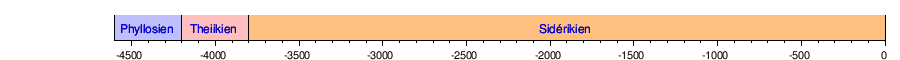 Cette chronologie demeure encore approchée, une discontinuité entre Phyllosien et Theiikien étant parfois insérée pour rendre compte de la rupture géologique introduite par la phase d'intense volcanisme de la fin du Noachien, voire par l'épisode du grand bombardement tardif qui correspond à peu près à cette date.