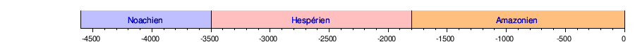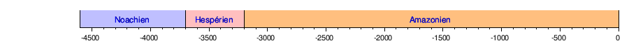 L'échelle des temps géologiques martiens élaborée par l'astronome américain William Hartmann remonte aux années 1970 et propose, à partir de la densité et de la morphologie des cratères sur les différents terraines de la planète, la chronologie suivante (dates en millions d'années) :