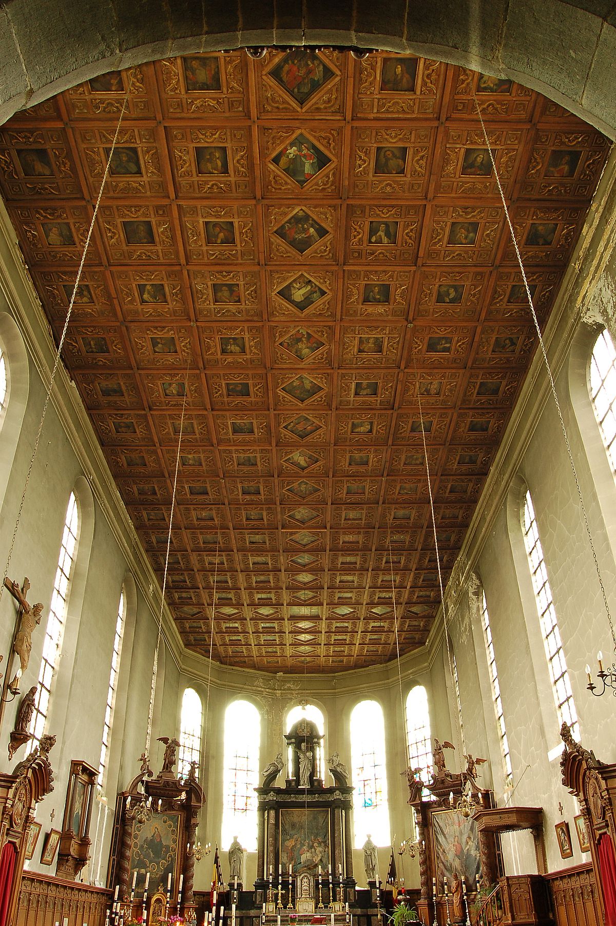 - Le plafond est remarquable. Il est plat et composé de 21 rangées de sept caissons (5 caissons sur la dernière rangée, au fond du choeur). Chaque caisson en bois de chêne comprend une peinture représentant, les évangélistes, des docteurs de l’Eglise et divers saints et bienheureux de l’église. La rangée centrale transversale forme avec la quatrième rangée une croix latine : les cadres de peinture, en losange, y sont plus larges, soulignant l’importance donnée aux Les mystères de la vie de la Vierge Marie et aux dogmes mariaux qui y sont représentés.