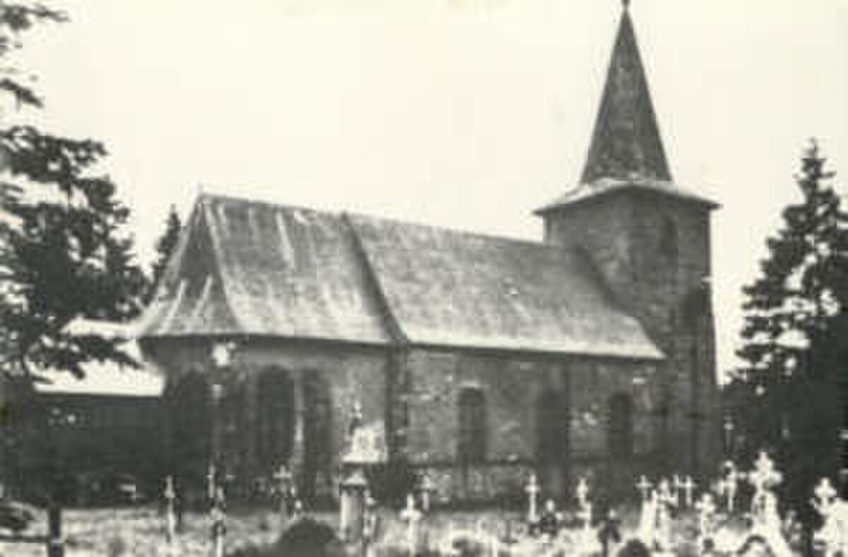 Ainsi, jusqu'au milieu du XXe, se trouvait - à l'emplacement du cimetière actuel - une église de style gothique, construite en plusieurs phases entre le XIIe et le XVIIIe siècle. L'édifice était simple, avec une vaste nef accolée à un clocher massif (XIIe siècle). L'entrée principale se situait latéralement par rapport à son axe.