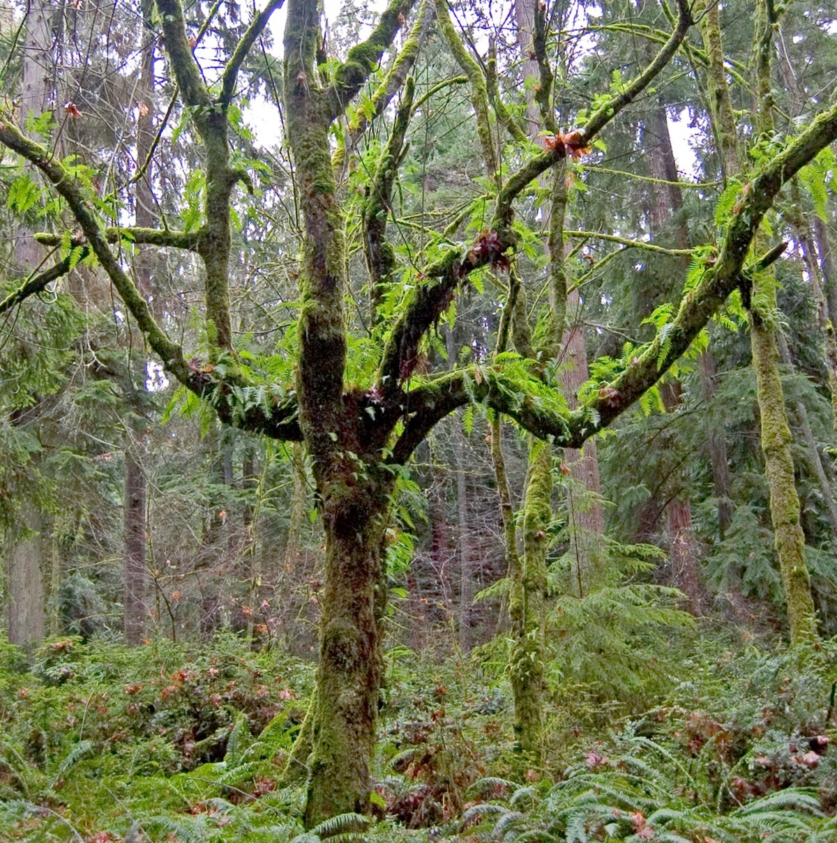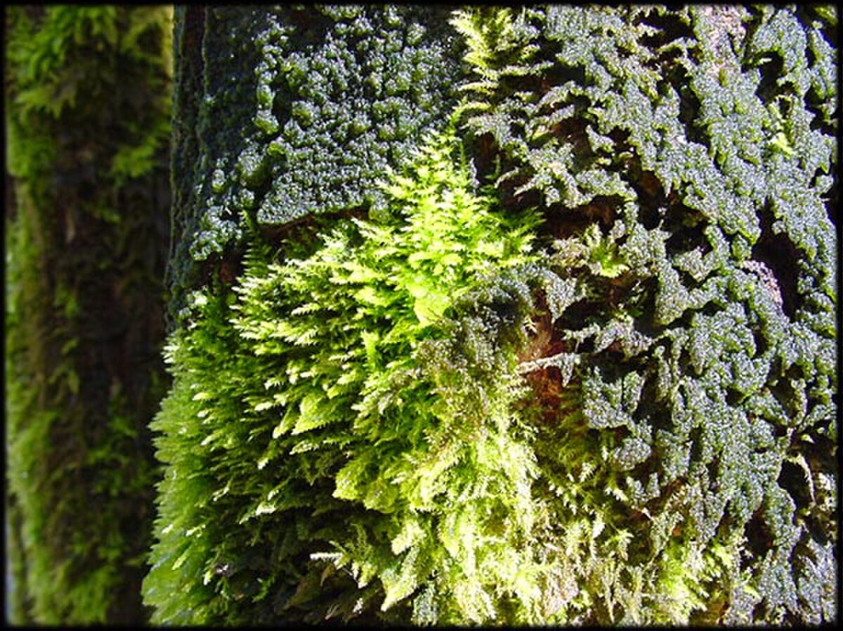 En zone tempérée, en présence d'une atmosphère humide et peu polluée, les arbres peuvent également être couverts d'épiphytes essentiellement constituées de mousses, lichens et fougères |