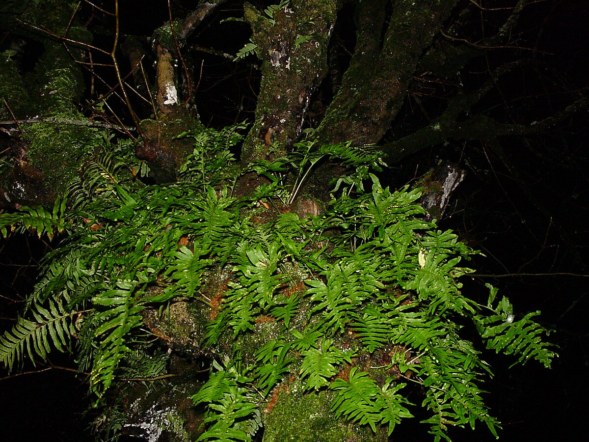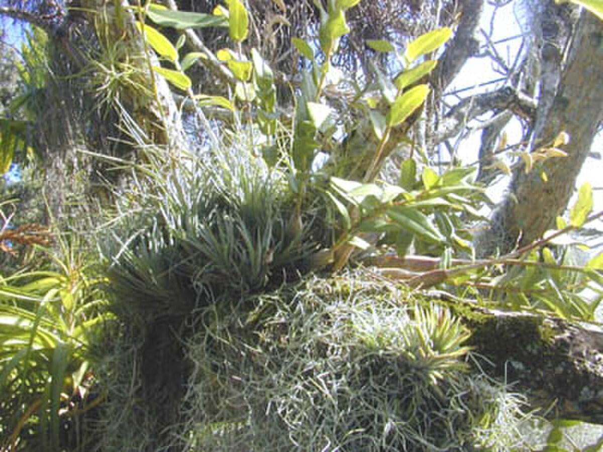 | Ananas sauvage (Glomeropitcairnia penduliflora) en Guadeloupe suspendu sur un arbre | Sur les berges de la rivière Auray en Bretagne, grâce à une atmosphère humide et peu polluée (vallée, proximité de la mer), les arbres sont couverts d'épiphytes ; mousses, lichens et fougères essentiellement | ||