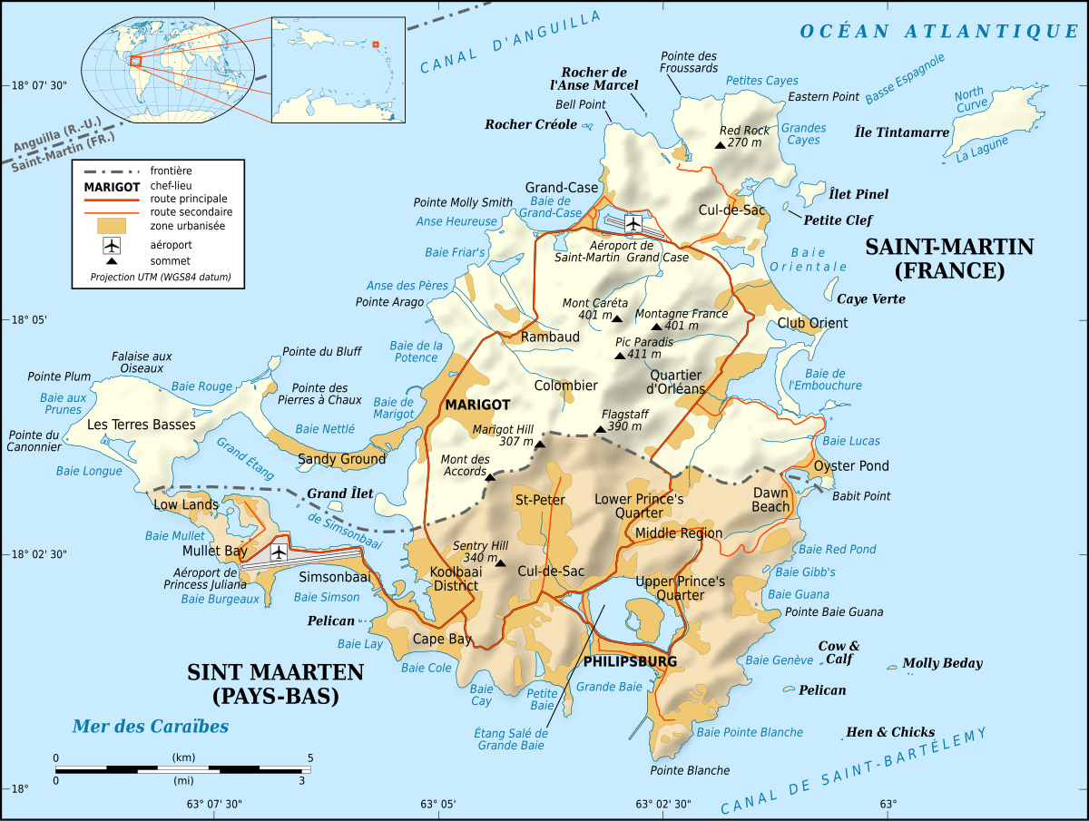 La frontière franco-néerlandaise, fixée par le Traité de Concordia le 23 mars 1648, s'étend sur 10 km. Elle coupe l'île de Saint-Martin suivant une direction ouest-est à peu près aux deux-tiers de l'île en partant du nord. La partie française s'étend au nord, la partie néerlandaise au sud.