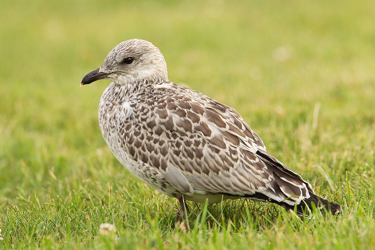 Les adultes mesurent 49 cm de long et ont une envergure de 124 cm. Ils possèdent une tête, un cou et un dessous blancs ainsi qu'un bec jaune relativement petit orné d’un anneau noir. Le dos et les ailes sont gris-argent, les pattes et les yeux sont jaunes. Comme chez de nombreux laridae, le plumage des jeunes oiseaux est différent de celui des adultes. Son apparence change à chaque mue automnale et le plumage adulte n'est acquis que lors de la troisième année.