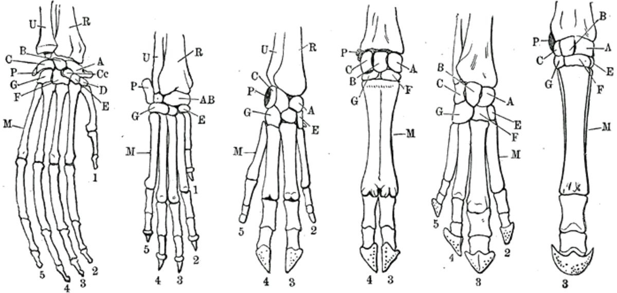 C'est le cas, par exemple, de la patte antérieure d'un cheval et de la nageoire pectorale d'un dauphin, qui ont comme ancêtre commun un mammifère (qui, il y a 80 millions d'années, ressemblait probablement à un chevrotain), qui possédait comme ces deux animaux quatre membres et c'est le membre antérieur de ce mammifère primitif qui a donné la patte du cheval et la nageoire du dauphin.