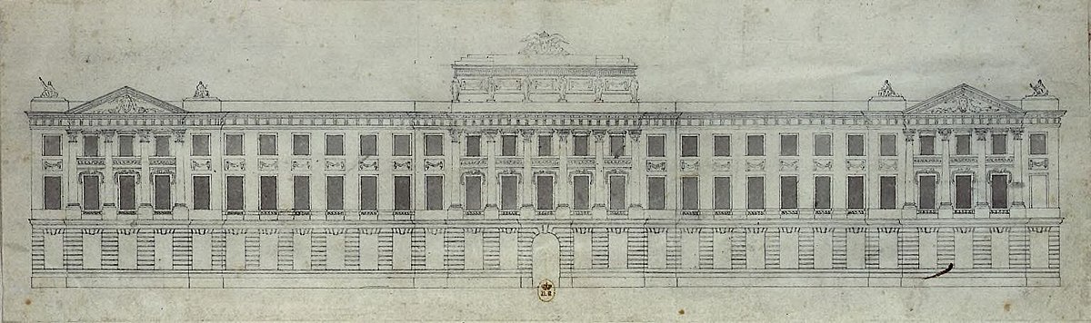 La façade sur le quai semble avoir été inspirée par le projet de Boullée, qui avait été gravé. À l'origine, Antoine avait envisagé de revêtir le mur de soutènement du quai de rampes ornées de vigoureux bossages qui auraient formé le socle de sa composition.