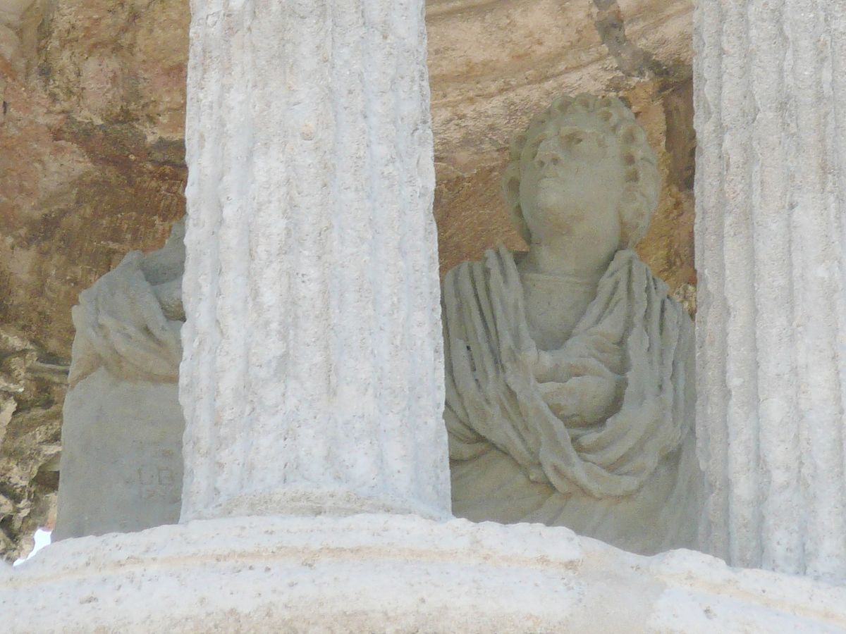 Un petit temple rond à colonnes (tholos) couronne le monument. Cette partie supérieure se rattache au monde céleste, par la forme symbolique ronde de la tholos. Elle abrite les statues du défunt et probablement de son fils, debout et dignes, revêtus de la toge, emblème de leur citoyenneté romaine, obtenue grâce à l’exploit illustré sur les bas-reliefs du premier niveau.